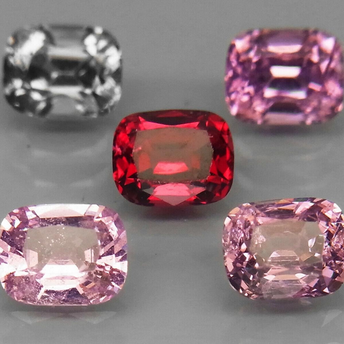 Spinel SHAPE Classic Cushion; WEIGHT 2.70 Ct.SIZE 5 X 4 mm QUANTITY 5 Pieces; COLOR Fancy Color ; CLARITY VS ; LUSTER Superior ORIGIN Myanmar/ Burma;TREATMENT None HARDNESS 8