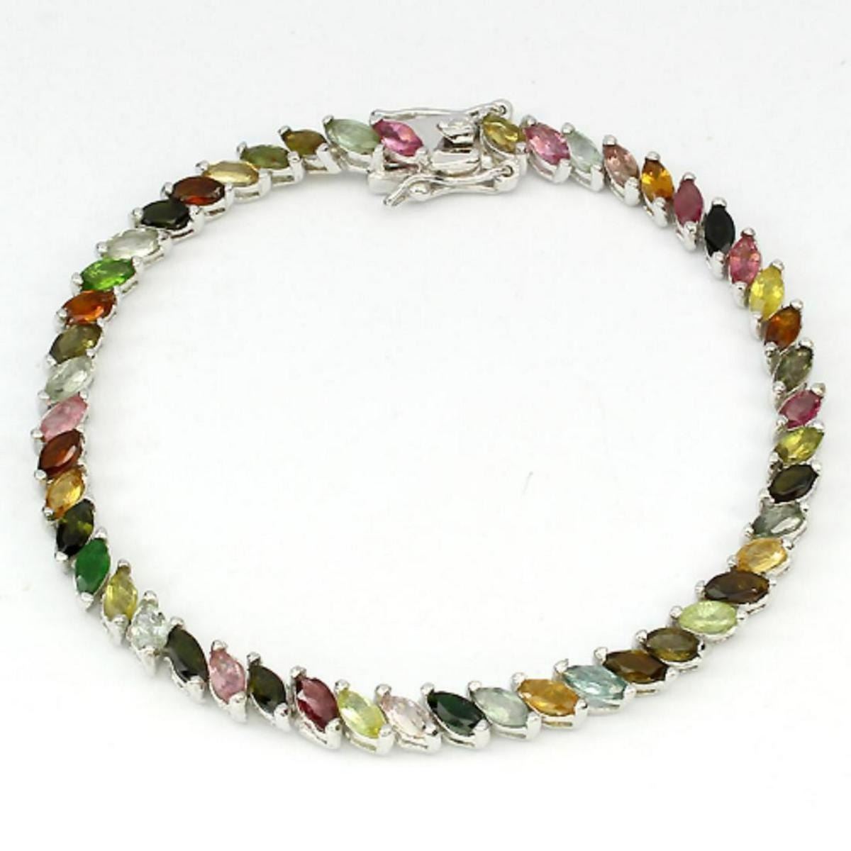 FANCY TOURMALINE (NATURAL) 14K WHITE GOLD COATING 925 SILVER BRACELET;UNIT OF ITEM (S):1 PIECE;WEIGHT (CT.):57.90 CT. (total weight of silver + stone);DIMENSION:* STONE 5.0 X 2.5 MM. * LENGTH 7.0 INCHES.; * FACE BRACELET 176.0 X 4.0 MM.;SHAPE/CUT:MARQUISE FACET;COLOR:TOP FANCY COLORS;CLARITY/GRADE:IF TO VVS TRANSPARENT;LUSTER:FASCINATING;TREATMENT:UNHEATED;ORIGIN:BRAZIL;HARDNESS:7.0 - 7.5