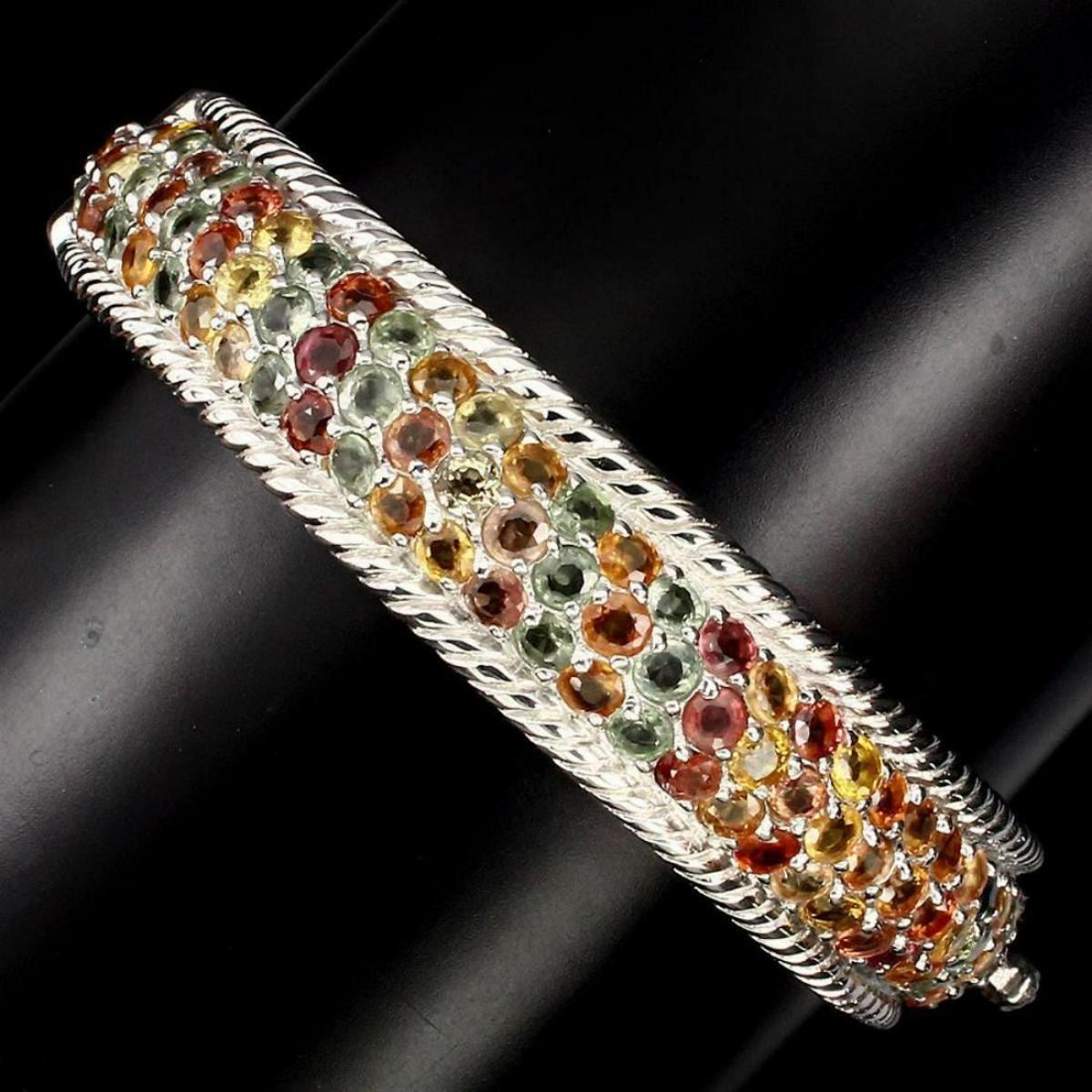 925 STERLING SILVER;;PLATE....14K WHITE GOLD;MAIN STONE.....SAPPHIRE.OTHER GEMSTOTAL WEIGHT158.18 CT (TOTAL WEIGHT OF SILVER + STONE)DIMENSION* STONE 3.0 MM. * DIAMETER 2.1 X 2.0 INCHES. * FACE BANGLE 63.0 X 13.0 MM.MAIN STONE SHAPEROUND CUTMAIN STONE COLORMULTI-COLORCLARITY/GRADEIF TO VVSLUSTERGLORIOUSTREATMENTHEATEDORIGIN - AFRICAHARDNESS9.0