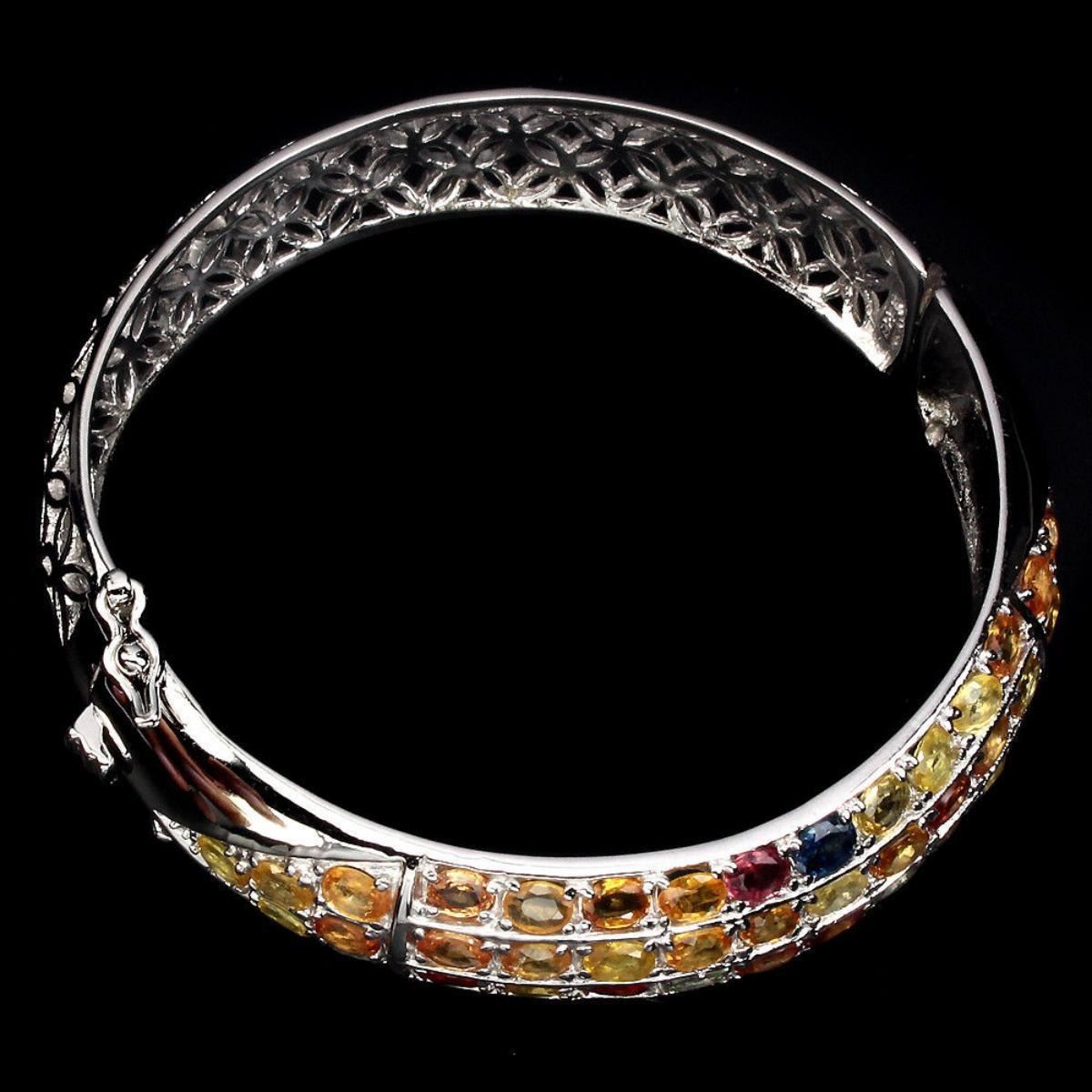 925 STERLING SILVER; PLATE -14K WHITE GOLD; LENGTH (INCHES) 1.9; MAIN STONE SAPPHIRE TOTAL WEIGHT 163.14 CT (TOTAL WEIGHT OF SILVER + STONE) DIMENSION * STONE 4.0 X 3.0 MM. * DIAMETER 1.9 INCHES. * FACE BANGLE 61.0 X 13.0 MM. MAIN STONE SHAPE OVAL CUT MAIN STONE COLOR MULTI-COLOR CLARITY/GRADE IF TO VVS LUSTER RAVISHING TREATMENT HEATED ORIGIN SONGEA - AFRICA HARDNESS 9