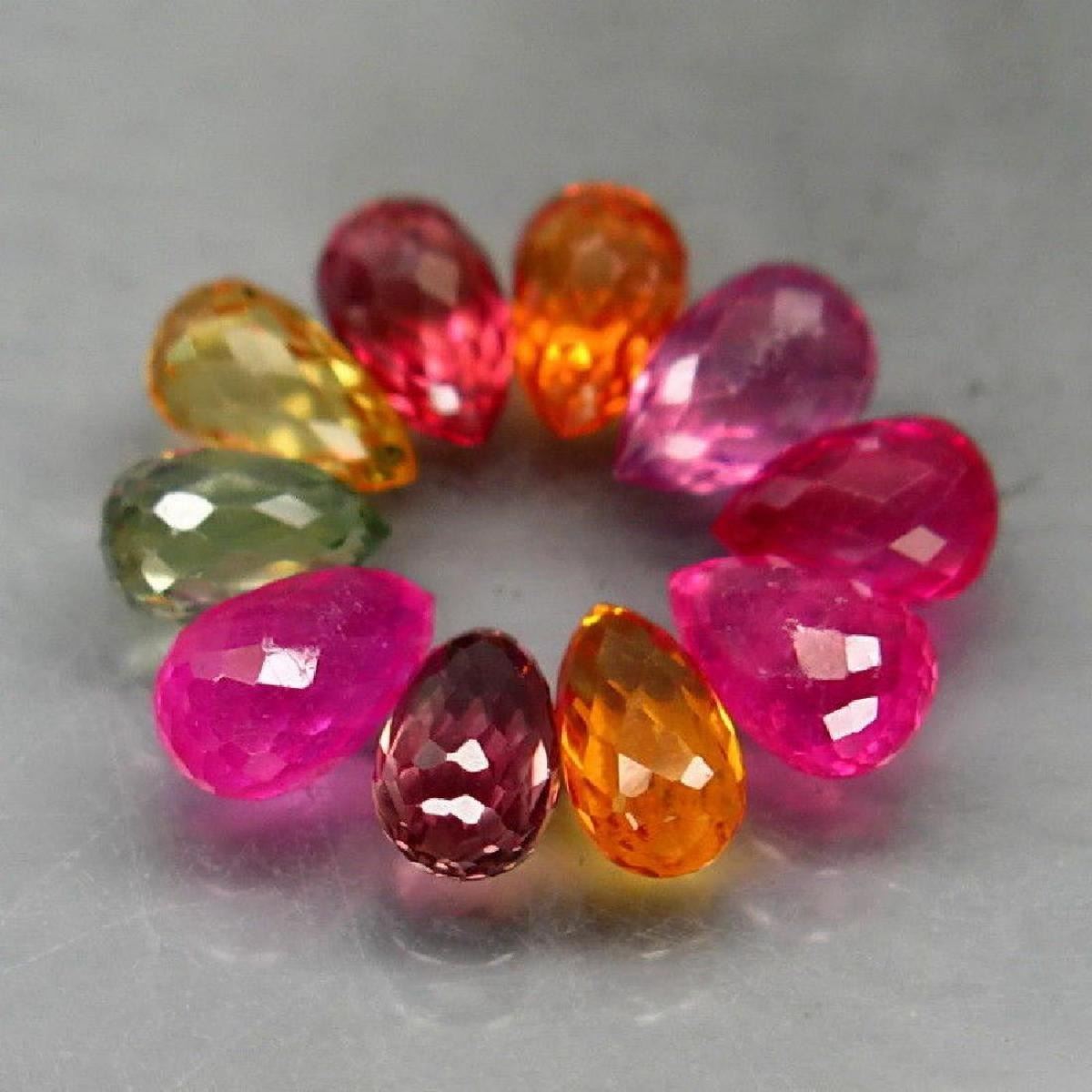 Natural Sapphire (Heated)SHAPE Briolette WEIGHT 5.30 Ct. SIZE 5x3 X to X 5.5x3.5 mm; QUANTITY 10 Pieces COLOR Fancy Color CLARITY VS SI ; ORIGIN Africa; TREATMENT Heated HARDNESS 9