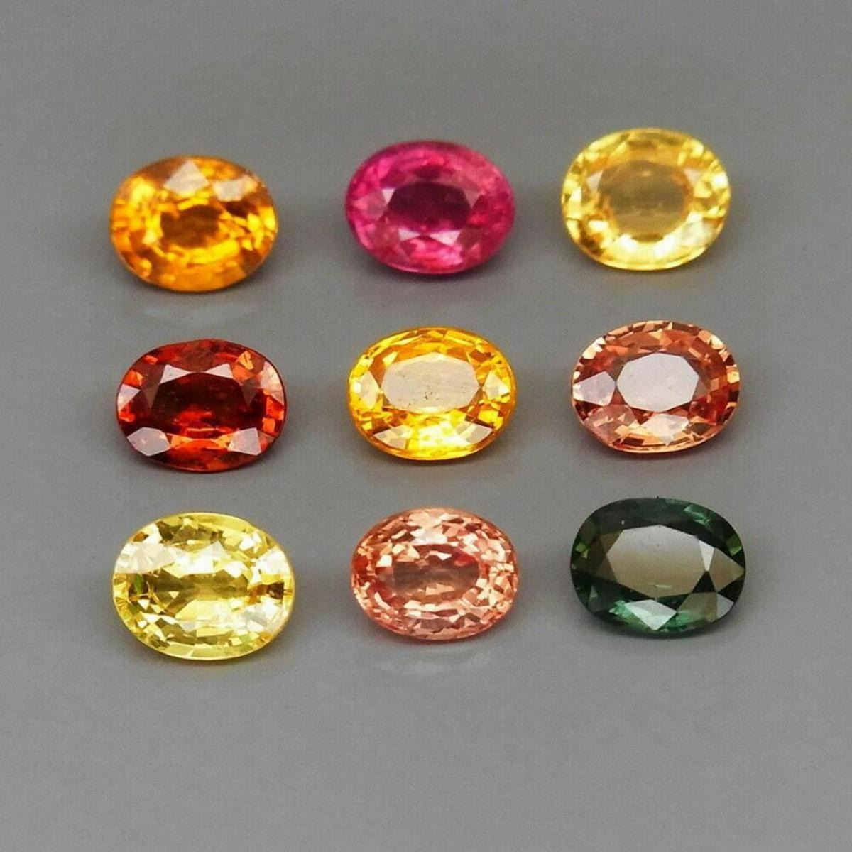Natural Sapphire ;SHAPE Oval WEIGHT 3.93 Ct.SIZE 5 X 4 mm QUANTITY 9 PiecesCOLORFancy ColorCLARITYVS & SILUSTERSuperiorORIGINSongea, Africa TREATMENT ; HARDNESS 9