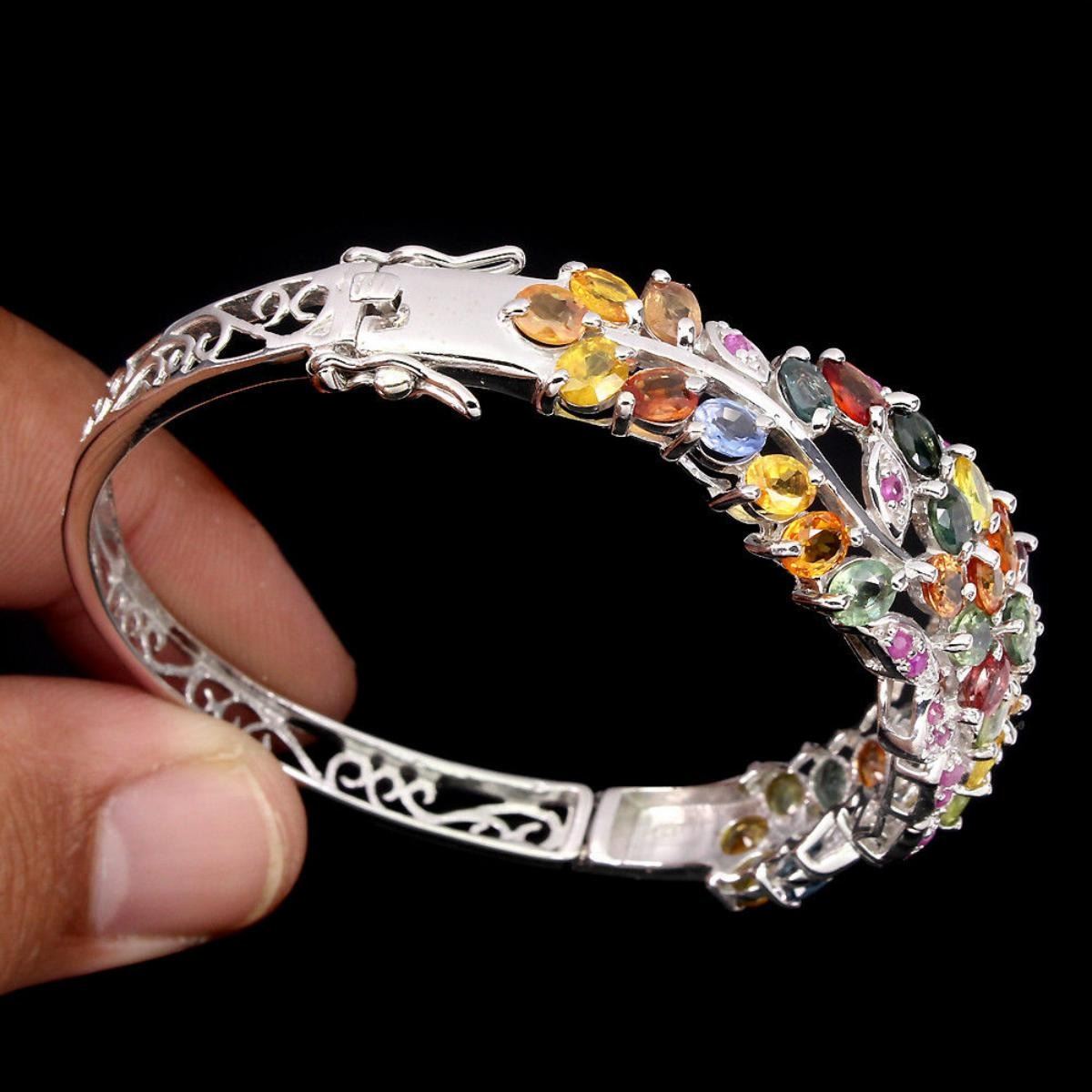 925 STERLING SILVER;PLATE....14K WHITE GOLD;...LENGTH (INCHES)2;MAIN STONESAPPHIRE...OTHER GEMSRUBY;TOTAL WEIGHT107.55 CT (TOTAL WEIGHT OF SILVER + STONE)DIMENSION* STONE 1.5 TO 5.0 X 4.0 MM. * DIAMETER 2.0 INCHES. * FACE BANGLE 62.0 X 22.0 MM.MAIN STONE SHAPEOVAL CUTMAIN STONE COLORMULTI-COLORCLARITY/GRADEIF TO VVSLUSTERPRECIOUSTREATMENTHEATEDORIGINSONGEA - AFRICAHARDNESS9.0