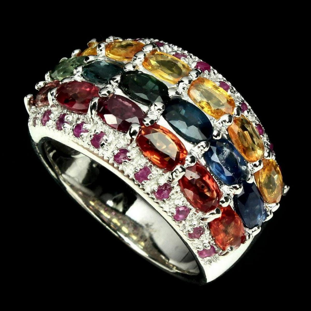 925 STERLING SILVER;PLATE14K WHITE GOLD;RING SIZE8(resizeable)MAIN STONESAPPHIRE;OTHER GEMSRUBY;TOTAL WEIGHT47.76 CT (TOTAL WEIGHT OF SILVER + STONE)DIMENSION* STONE 1.0 TO 5.0 X 3.0 MM. * RING SIZE 8.0 * FACE RING 25.0 X 14.0 MM.;MAIN STONE SHAPEOVAL CUT;MAIN STONE COLORMULTI-COLOR;CLARITY/GRADEIF TO VVS;LUSTERDELUXE;TREATMENTHEATED;ORIGIN - AFRICA;HARDNESS9