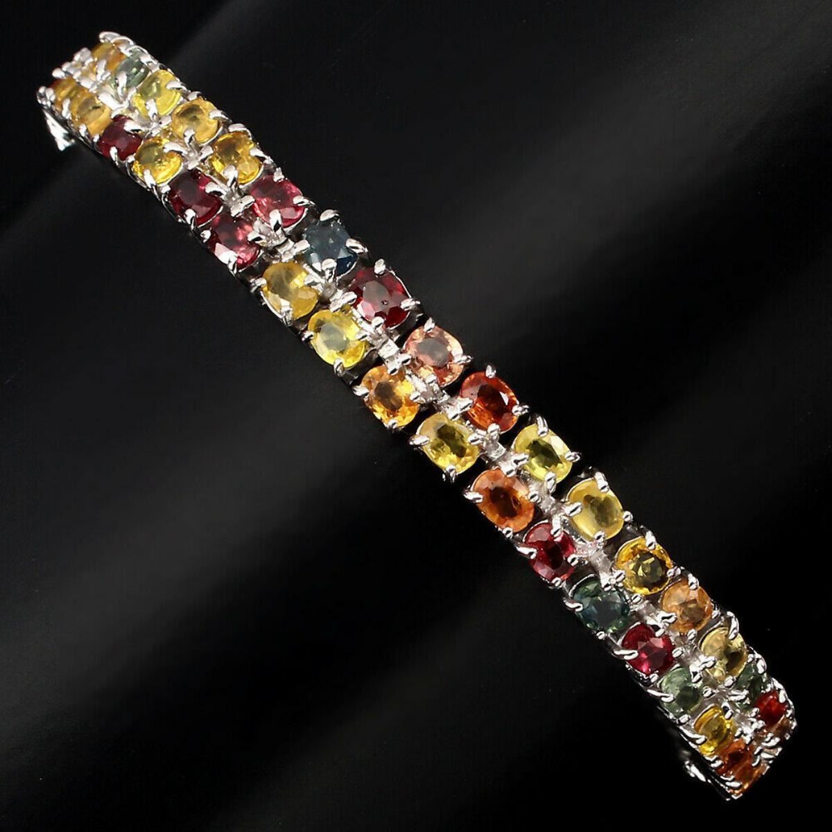 925 STERLING SILVER;PLATE....14K WHITE GOLD;LENGTH (INCHES)7.5;MAIN STONE-SAPPHIRE;TOTAL WEIGHT-99.32 CT (TOTAL WEIGHT OF SILVER + STONE)DIMENSION* STONE 4.0 X 3.0 MM. * FACE BRACELET 175.0 X 8.0 MM.-MAIN STONE SHAPE-OVAL CUT-MAIN STONE COLOR-TOP FANCY COLORS-CLARITY/GRADEIF TO VVS;TREATMENT-HEATED;ORIGIN - AFRICA;HARDNESS9;