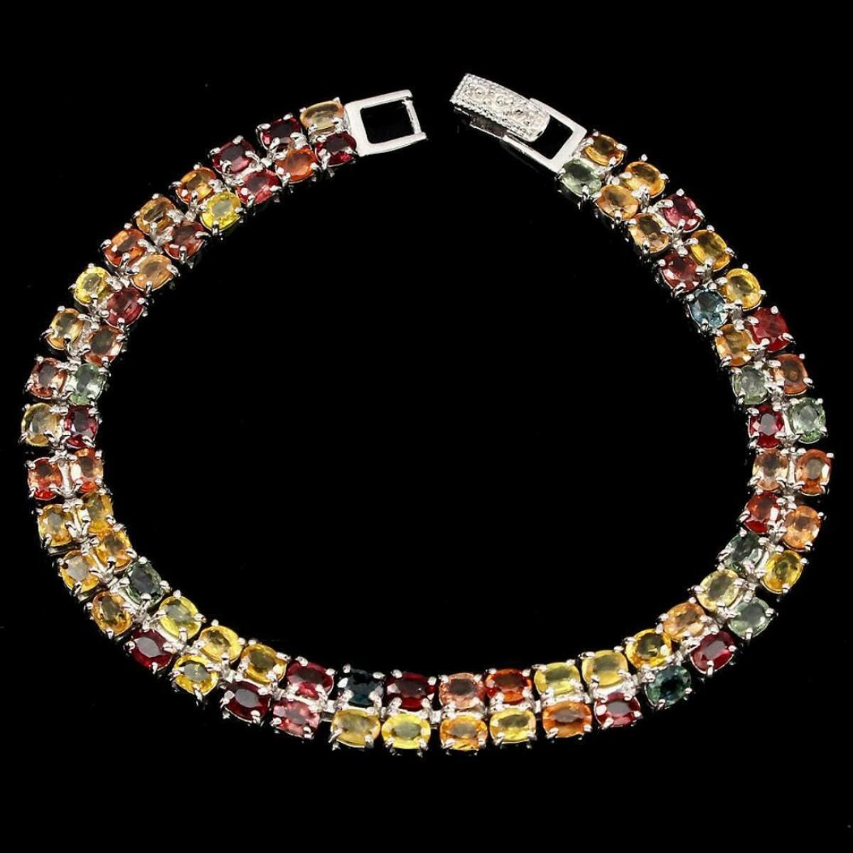925 STERLING SILVER;PLATE....14K WHITE GOLD;LENGTH (INCHES)7.5;MAIN STONE-SAPPHIRE;TOTAL WEIGHT-99.32 CT (TOTAL WEIGHT OF SILVER + STONE)DIMENSION* STONE 4.0 X 3.0 MM. * FACE BRACELET 175.0 X 8.0 MM.-MAIN STONE SHAPE-OVAL CUT-MAIN STONE COLOR-TOP FANCY COLORS-CLARITY/GRADEIF TO VVS;TREATMENT-HEATED;ORIGIN - AFRICA;HARDNESS9;