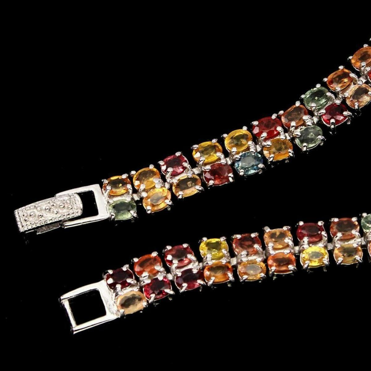 925 STERLING SILVER;PLATE....14K WHITE GOLD;LENGTH (INCHES)7.5;MAIN STONE-SAPPHIRE;TOTAL WEIGHT-99.32 CT (TOTAL WEIGHT OF SILVER + STONE)DIMENSION* STONE 4.0 X 3.0 MM. * FACE BRACELET 175.0 X 8.0 MM.-MAIN STONE SHAPE-OVAL CUT-MAIN STONE COLOR-TOP FANCY COLORS-CLARITY/GRADEIF TO VVS;TREATMENT-HEATED;ORIGIN - AFRICA;HARDNESS9;