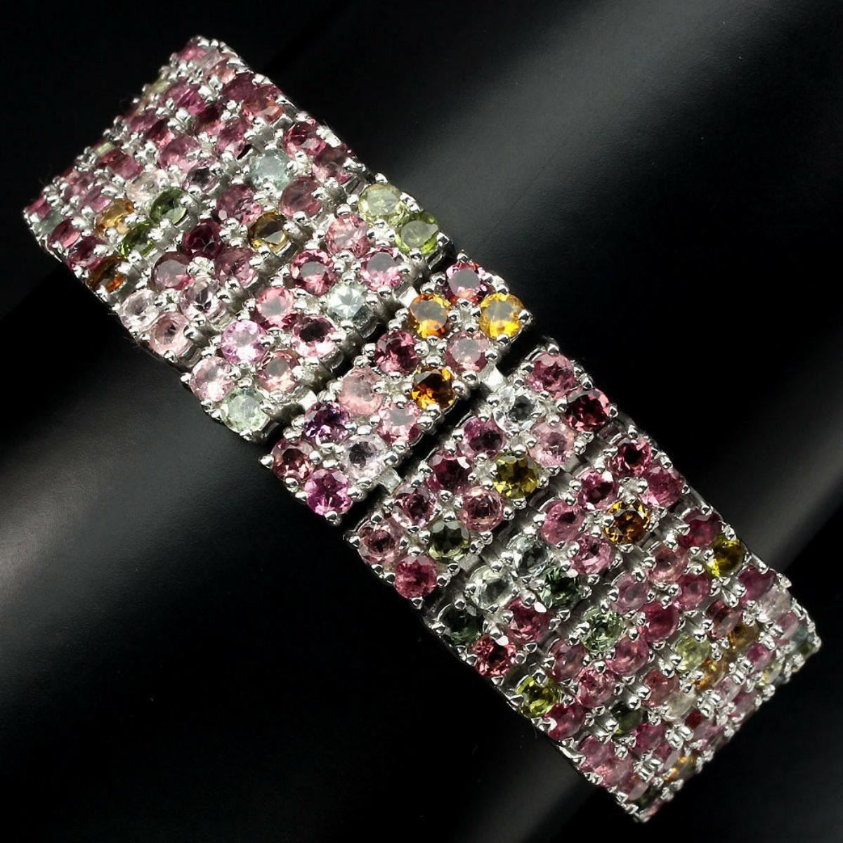 925 STERLING SILVER;PLATE......14K WHITE GOLD;LENGTH (INCHES)7.5.;MAIN STONETOURMALINE.;TOTAL WEIGHT-274.24 CT (TOTAL WEIGHT OF SILVER + STONE)DIMENSION* STONE 3.0 MM. * FACE BRACELET 180.0 X 20.0 MM.MAIN STONE SHAPE-ROUND CUT.MAIN STONE COLOR-TOP FANCY COLORS.CLARITY/GRADE-IF TO VVS.LUSTER-EXQUISITE.TREATMENT-UNHEATED.ORIGIN-BRAZIL.HARDNESS-7.0 - 7.5.