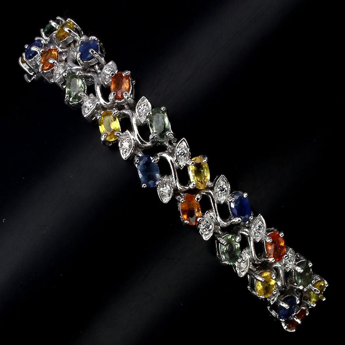 925 STERLING SILVER;PLATE-14K WHITE GOLD;LENGTH (INCHES)7.5;MAIN STONE-SAPPHIRE;OTHER GEMS-CUBIC ZIRCONIA;TOTAL WEIGHT-116.28 CT (TOTAL WEIGHT OF SILVER + STONE)DIMENSION* STONE 5.0 X 3.0 MM. * CZ 1.5 MM. * FACE BRACELET 173.0 X 10.0 MM.;MAIN STONE SHAPE-OVAL CUT;MAIN STONE COLOR-MULTI-COLOR;CLARITY/GRADE-IF TO VVS;LUSTER-MESMERIZING;ORIGIN-SONGEA - AFRICAHARDNESS-9;
