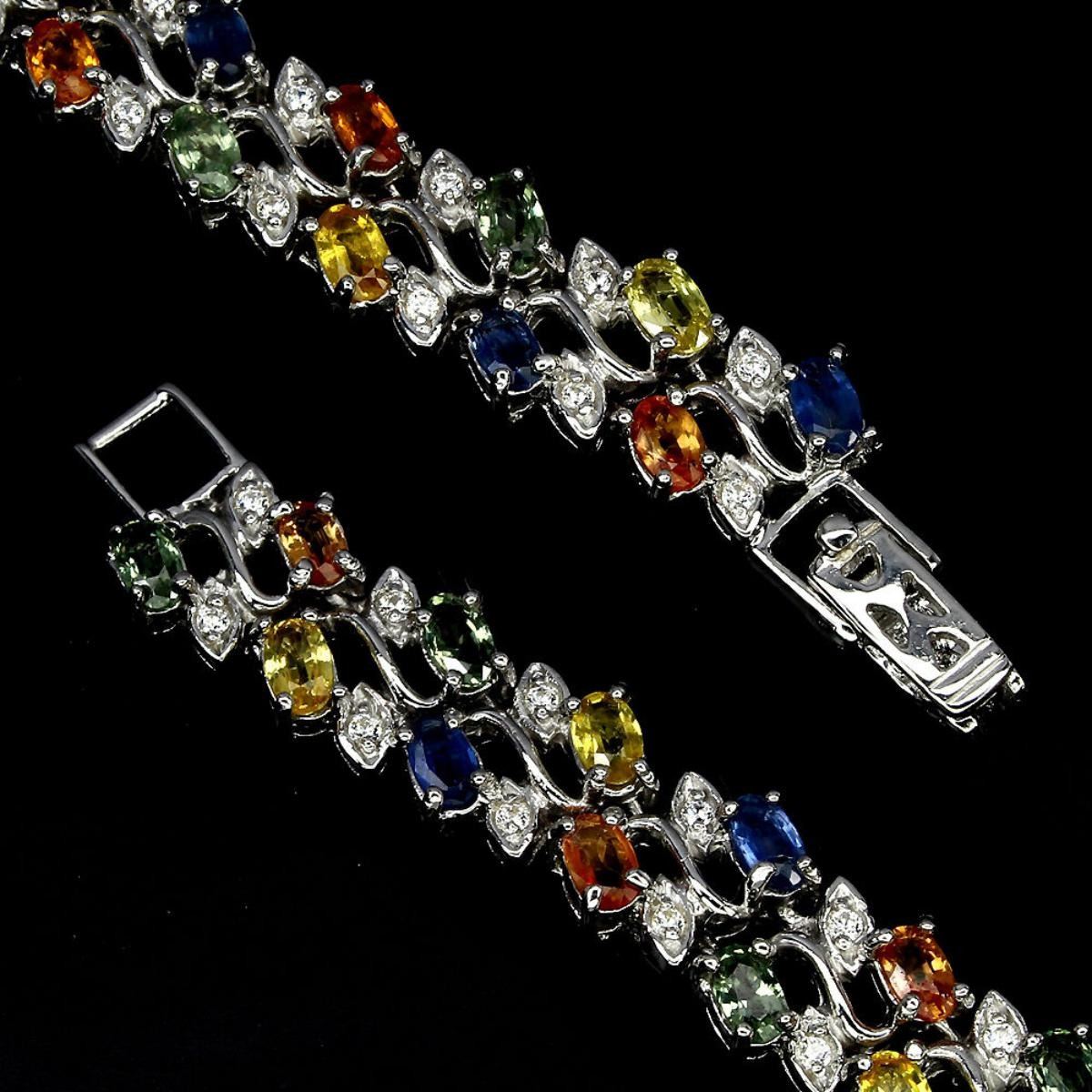 925 STERLING SILVER;PLATE-14K WHITE GOLD;LENGTH (INCHES)7.5;MAIN STONE-SAPPHIRE;OTHER GEMS-CUBIC ZIRCONIA;TOTAL WEIGHT-116.28 CT (TOTAL WEIGHT OF SILVER + STONE)DIMENSION* STONE 5.0 X 3.0 MM. * CZ 1.5 MM. * FACE BRACELET 173.0 X 10.0 MM.;MAIN STONE SHAPE-OVAL CUT;MAIN STONE COLOR-MULTI-COLOR;CLARITY/GRADE-IF TO VVS;LUSTER-MESMERIZING;ORIGIN-SONGEA - AFRICAHARDNESS-9;