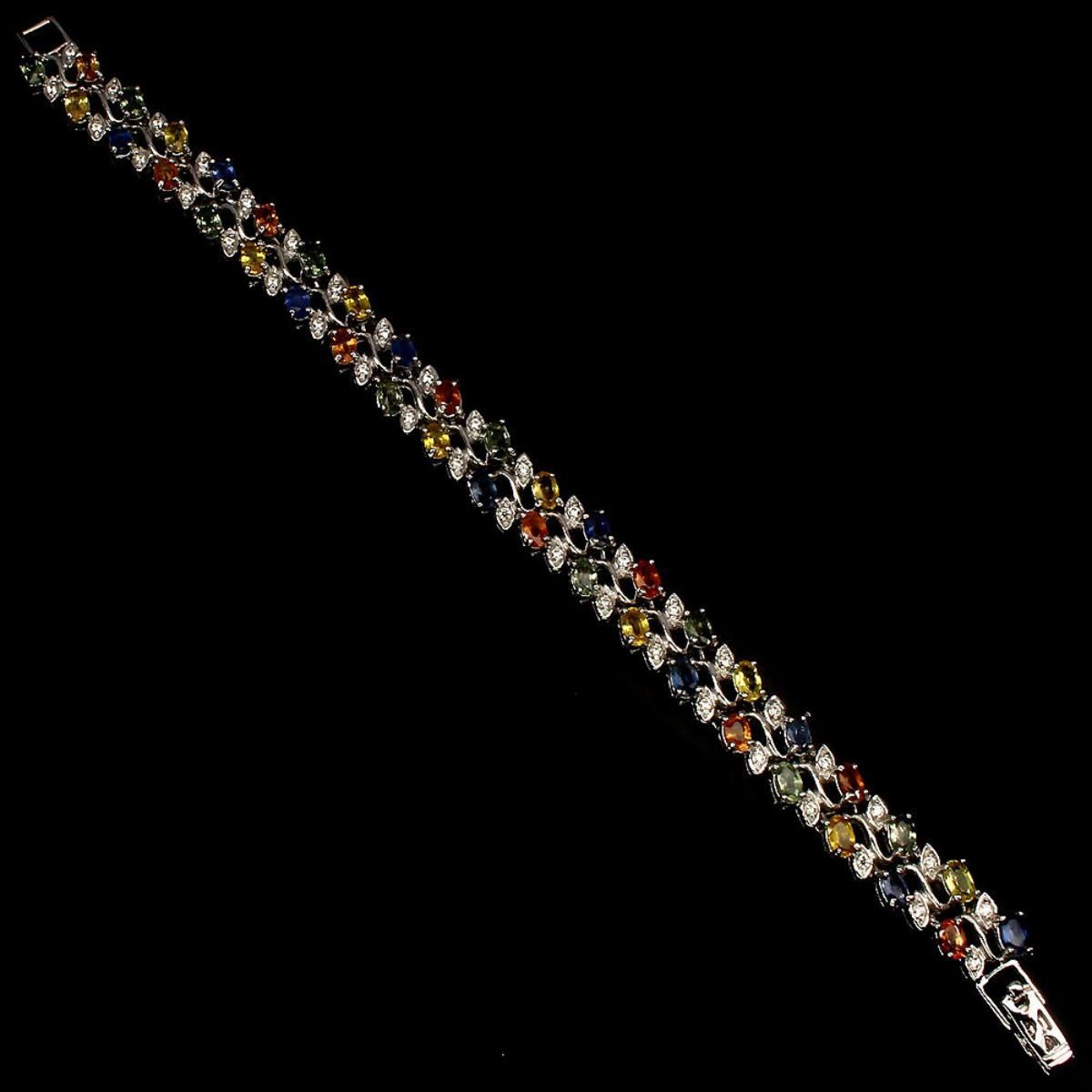 925 STERLING SILVER;PLATE-14K WHITE GOLD;LENGTH (INCHES)7.5;MAIN STONE-SAPPHIRE;OTHER GEMS-CUBIC ZIRCONIA;TOTAL WEIGHT-116.28 CT (TOTAL WEIGHT OF SILVER + STONE)DIMENSION* STONE 5.0 X 3.0 MM. * CZ 1.5 MM. * FACE BRACELET 173.0 X 10.0 MM.;MAIN STONE SHAPE-OVAL CUT;MAIN STONE COLOR-MULTI-COLOR;CLARITY/GRADE-IF TO VVS;LUSTER-MESMERIZING;ORIGIN-SONGEA - AFRICAHARDNESS-9;