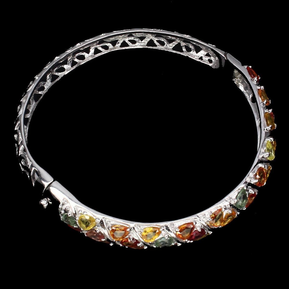925 STERLING SILVER; PLATE -14K WHITE GOLD; MAIN STONE -SAPPHIRE; TOTAL WEIGHT -122.08 CT (TOTAL WEIGHT OF SILVER + STONE) DIMENSION * STONE 5.0 X 4.0 MM. * DIAMETER 2.3 X 2.2 INCHES. * FACE BANGLE 67.0 X 10.0 MM.; MAIN STONE SHAPE -PEAR CUT; MAIN STONE COLOR -MULTI-COLOR; CLARITY/GRADE -IF TO VVS; LUSTER -PRECIOUS; TREATMENT -HEATED; ORIGIN SONGEA - AFRICA; HARDNESS 9.0