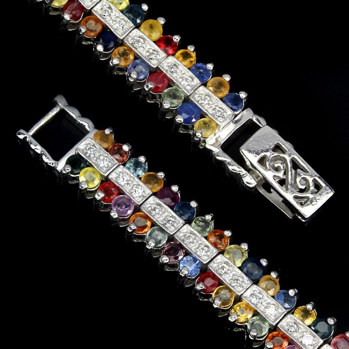 925 STERLING SILVER....PLATE-14K WHITE GOLD.LENGTH (INCHES)7.;MAIN STONE-SAPPHIRE;OTHER GEMS-CUBIC ZIRCONIA;TOTAL WEIGHT-139.95 CT (TOTAL WEIGHT OF SILVER + STONE)DIMENSION* STONE 2.5 MM. * CZ 1.5 MM. * FACE BRACELET 160.0 X 9.0 MM.;MAIN STONE SHAPE-ROUND CUT;MAIN STONE COLOR-MULTI-COLOR;CLARITY/GRADE-IF TO VVS;TREATMENT-HEATED;ORIGINSONGEA - AFRICA;HARDNESS-8.0 - 9.0;