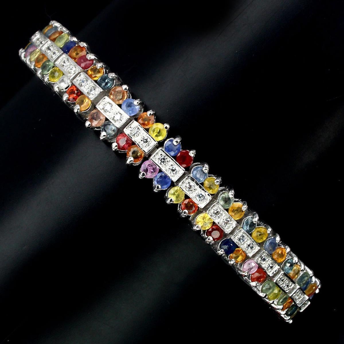 925 STERLING SILVER....PLATE-14K WHITE GOLD.LENGTH (INCHES)7.;MAIN STONE-SAPPHIRE;OTHER GEMS-CUBIC ZIRCONIA;TOTAL WEIGHT-139.95 CT (TOTAL WEIGHT OF SILVER + STONE)DIMENSION* STONE 2.5 MM. * CZ 1.5 MM. * FACE BRACELET 160.0 X 9.0 MM.;MAIN STONE SHAPE-ROUND CUT;MAIN STONE COLOR-MULTI-COLOR;CLARITY/GRADE-IF TO VVS;TREATMENT-HEATED;ORIGINSONGEA - AFRICA;HARDNESS-8.0 - 9.0;