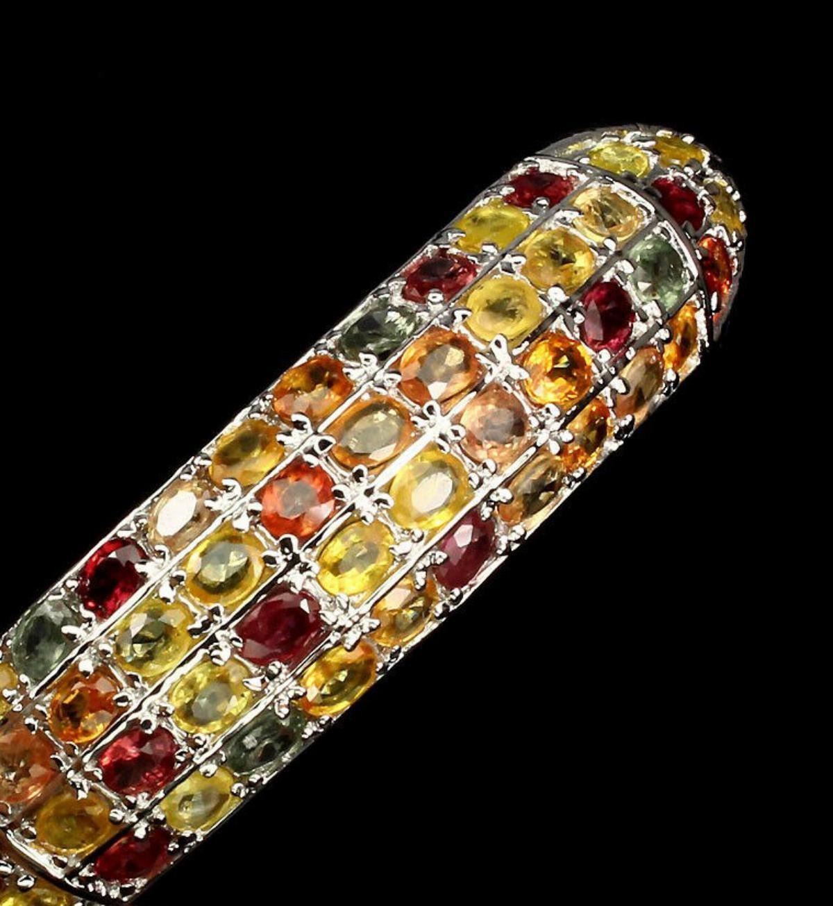 925 STERLING SILVER;PLATE-14K WHITE GOLD;MAIN STONE-SAPPHIRE;TOTAL WEIGHT-167.84 CT (TOTAL WEIGHT OF SILVER + STONE)DIMENSION* STONE 4.0 X 3.0 MM. * DIAMETER 2.1 X 2.0 INCHES. * FACE BANGLE 58.0 X 13.0 MM.;MAIN STONE SHAPE-OVAL CUT;MAIN STONE COLOR-MULTI-COLOR;CLARITY/GRADE-IF TO VVS;ORIGINSONGEA - AFRICA;HARDNESS-9;