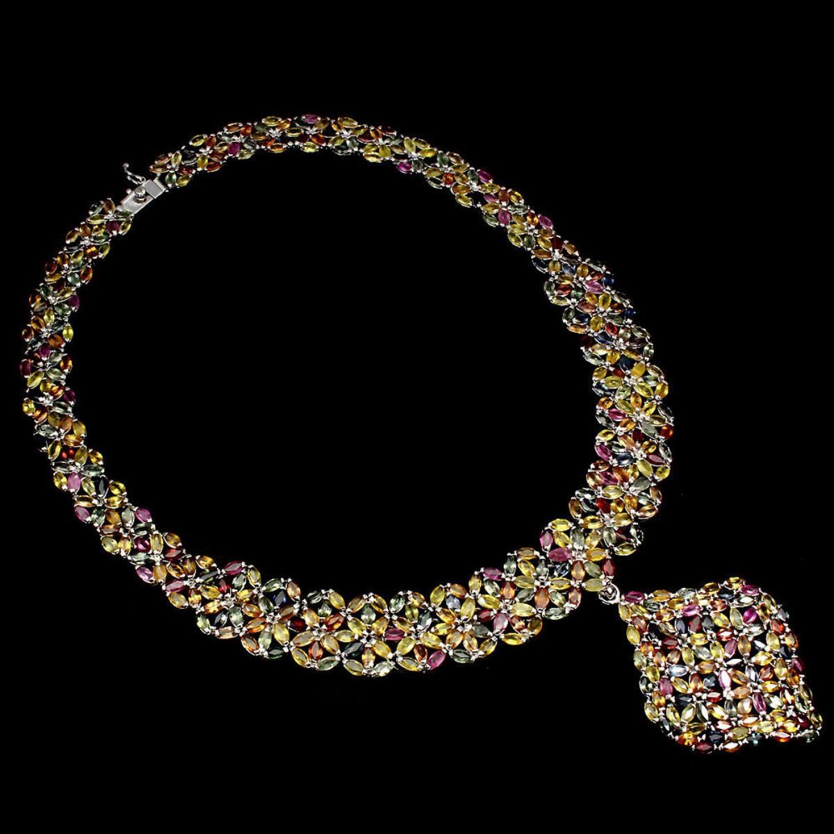 925 STERLING SILVER; PLATE -14K WHITE GOLD; LENGTH (INCHES) 15; MAIN STONE -SAPPHIRE; TOTAL WEIGHT -563.08 CT (TOTAL WEIGHT OF SILVER + STONE) DIMENSION * STONE 4.0 X 3.0 TO 5.0 X 3.0 MM. * STONES PART LENGTH 390.0 X 55.0 MM.; MAIN STONE SHAPE -MARQUISE CUT; MAIN STONE COLOR -MULTI-COLOR; CLARITY/GRADE -IF TO VVS; LUSTER -GLORIOUS; TREATMENT -HEATED; ORIGIN - AFRICA; HARDNESS -9;