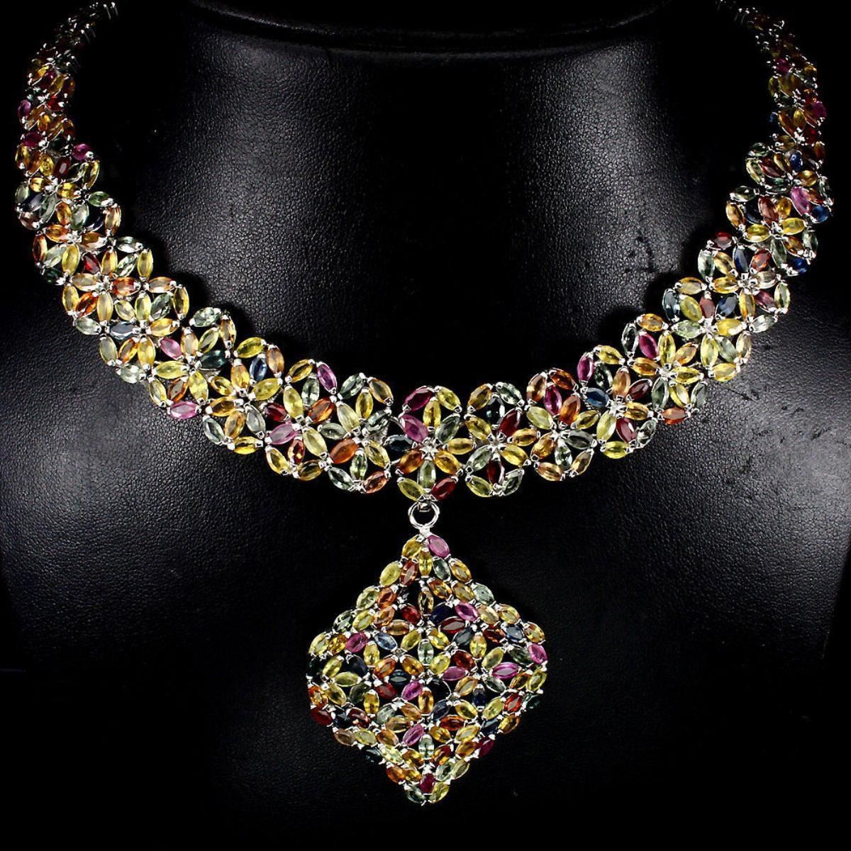 925 STERLING SILVER; PLATE -14K WHITE GOLD; LENGTH (INCHES) 15; MAIN STONE -SAPPHIRE; TOTAL WEIGHT -563.08 CT (TOTAL WEIGHT OF SILVER + STONE) DIMENSION * STONE 4.0 X 3.0 TO 5.0 X 3.0 MM. * STONES PART LENGTH 390.0 X 55.0 MM.; MAIN STONE SHAPE -MARQUISE CUT; MAIN STONE COLOR -MULTI-COLOR; CLARITY/GRADE -IF TO VVS; LUSTER -GLORIOUS; TREATMENT -HEATED; ORIGIN - AFRICA; HARDNESS -9;