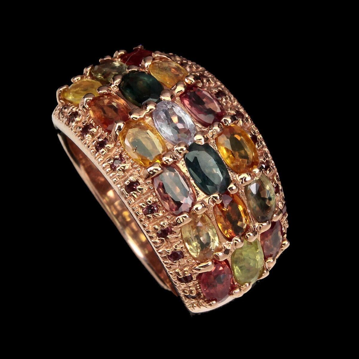 925 STERLING SILVER;PLATE-14K ROSE GOLD;RING SIZE-9(Resizeable)MAIN STONE-SAPPHIRE;OTHER GEMS-RHODOLITE GARNET;TOTAL WEIGHT-10.02 GRAM (TOTAL WEIGHT OF SILVER + STONE)DIMENSION* STONE 1.0 TO 5.0 X 3.0 MM. * RING SIZE 9.0 * FACE RING 25.0 X 14.0 MM.;MAIN STONE SHAPE-OVAL CUT;MAIN STONE COLOR-MULTI-COLOR;CLARITY/GRADE-IF TO VVS;LUSTER-DELUXE;ORIGIN - AFRICA;HARDNESS-9;