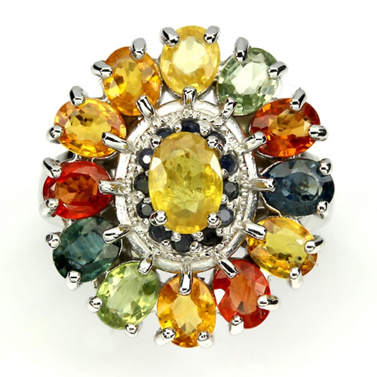 FANCY SAPPHIRE (NATURAL) 14K WHITE GOLD COATING 925 SILVER RING; Total WEIGHT (CT.):45.67 CT. ;DIMENSION:* STONE 1.5 TO 7.0 X 5.0 MM. * FACE RING 22.0 X 21.0 MM.;SHAPE/CUT:OVAL ROUND FACET;COLOR:TOP FANCY COLORS;CLARITY/GRADE:TRANSPARENT IF TO VVS;LUSTER:GORGEOUS;