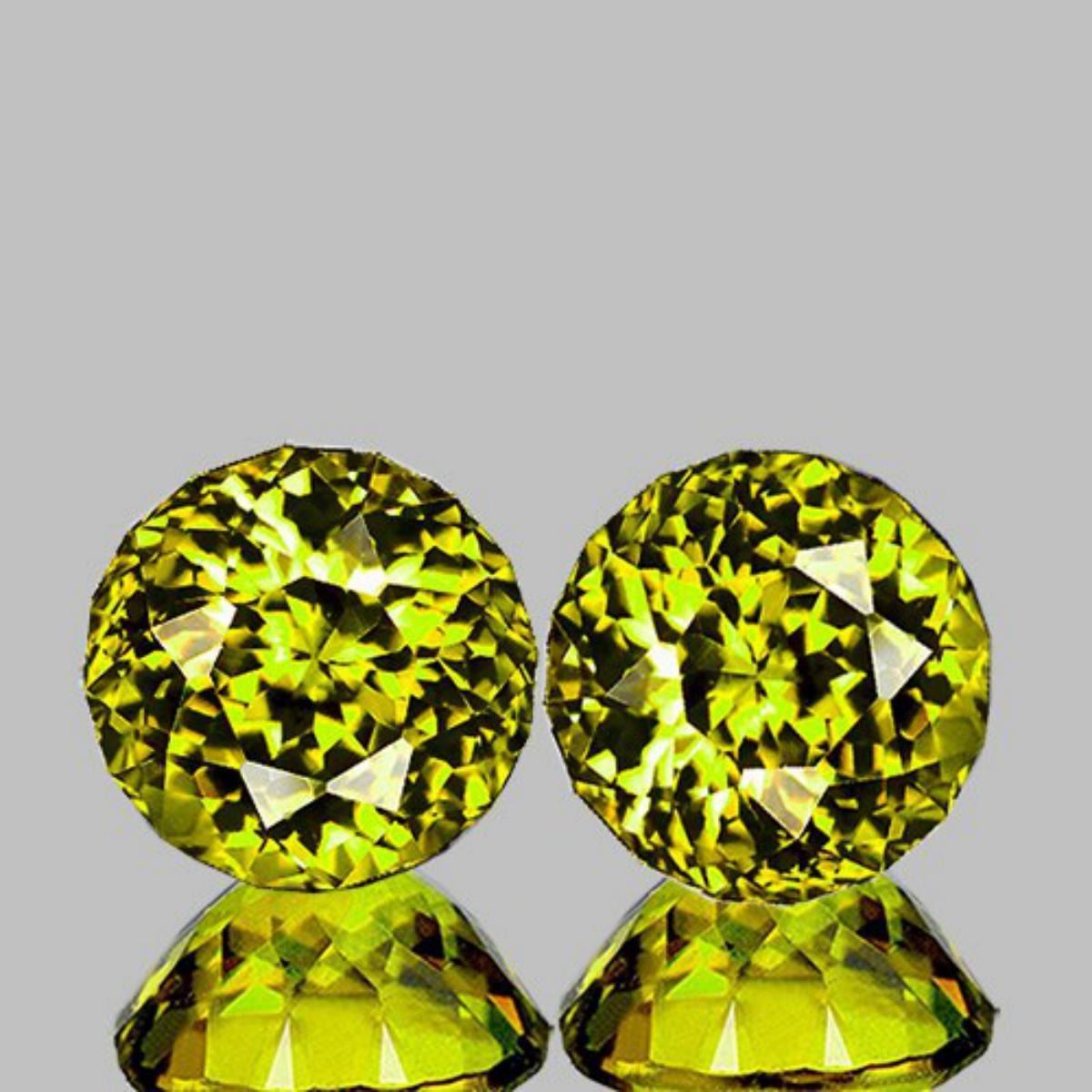 Natural Mali Garnet; WEIGHT : 1.66 cts; SHAPE : Round (Brilliant Cut) SIZE ( L x W x D ) : 5.20 mm; QUANTITY : 2 pieces (Perfect Matching Pair) COLOR : Green Yellow AAA Color; CLARITY : Flawless-VVS AAA Grade; ORIGIN : Sandare Mine in Mali’s Kayes Region; HARDNESS : 7; LUSTER : AAA Fire!!! TREATMENT : 100% Natural Unheated;