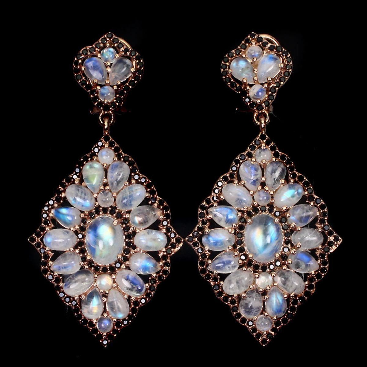 925 STERLING SILVER;PLATE14K ROSE GOLD;MAIN STONEMOONSTONE;OTHER GEMSBLACK SPINELTOTAL WEIGHT79.13 CT (TOTAL WEIGHT OF SILVER + STONE)DIMENSION* STONE 1.0 TO 9.0 X 7.0 MM. * FACE EARRINGS 58.0 X 29.0 MM.MAIN STONE SHAPEOVAL CABOCHONMAIN STONE COLORWHITE WITH FIRE BLUE LUSTERCLARITY/GRADETRANSPARENTLUSTERPRECIOUSTREATMENTUNHEATEDORIGININDIAHARDNESS5.5 - 8.0