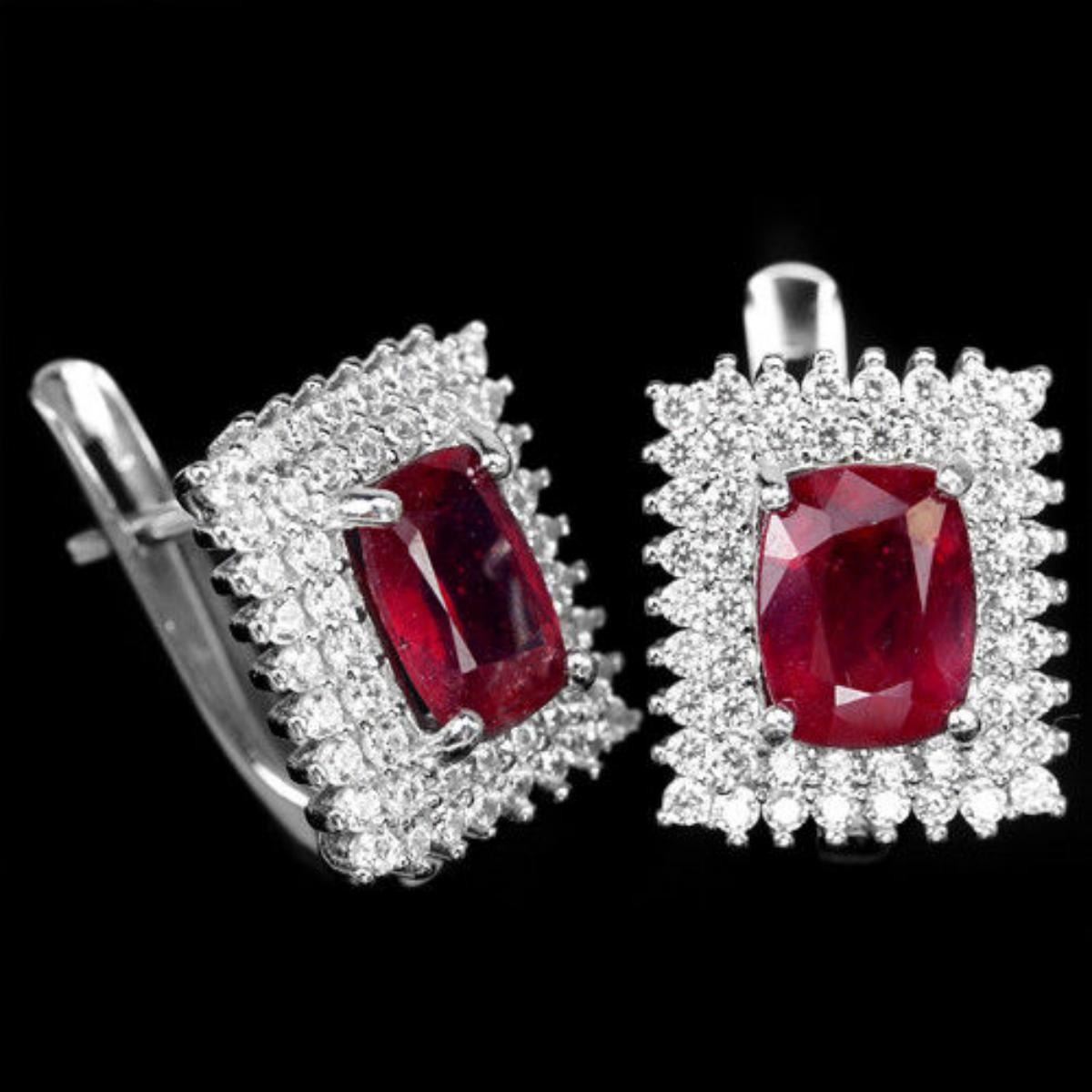GENUINE RED RUBY CUSHION & WHITE CZ 925 SILVER EARRING 14K WHITE GOLD COATING;STONE SHAPECUSHIONSTONE DIMENSION8 X 6 MM.ITEM WEIGHT5.19 GRAMCOLORREDCLARITYTRANSLUCENTLUSTERALLURINGTREATMENTHEATEDORIGIN OF STONEAFRICAHARDNESS9.0FACE OF EARRING 14 X 12 MM. WHITE CUBIC ZIRCONIA 1.2 MM.