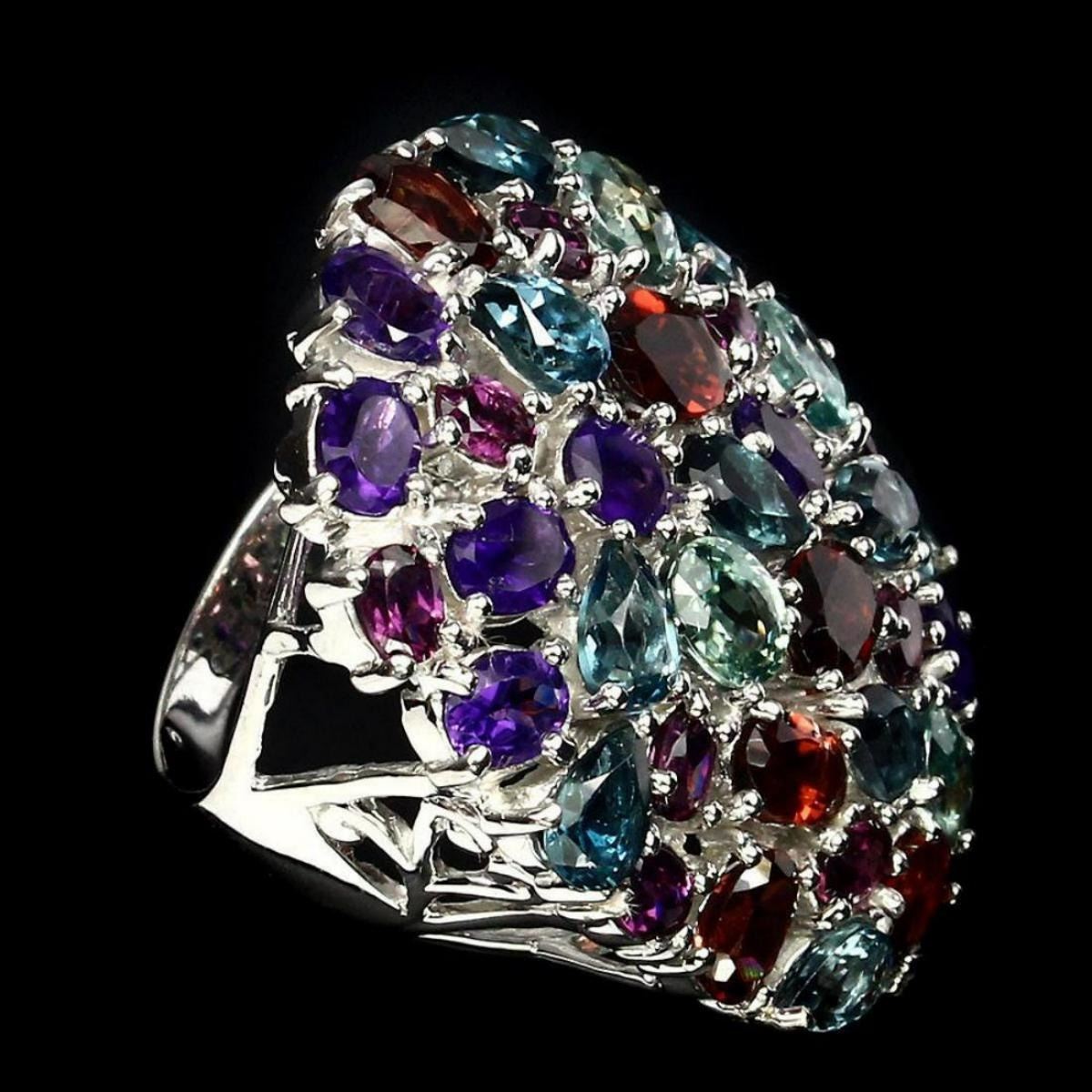 925 STERLING SILVERPLATE14K WHITE GOLDRING SIZE/..8; resizeable;MAIN STONEMOZAMBIQUE GARNETOTHER GEMSAMETHYST,LONDON BLUE TOPAZ,RHODOLITE GARNET,ZIRCONTOTAL WEIGHT76.82 CT (TOTAL WEIGHT OF SILVER + STONE)DIMENSION* STONE 4.0 X 3.0 TO 7.0 X 5.0 MM. * FACE RING 37.0 X 29.0 MM.MAIN STONE SHAPEOVAL CUTMAIN STONE COLORTOP REDDISHCLARITY/GRADEIF TO VVSLUSTERPRECIOUSTREATMENTUNHEATEDORIGINAFRICAHARDNESS7.0 - 7.5