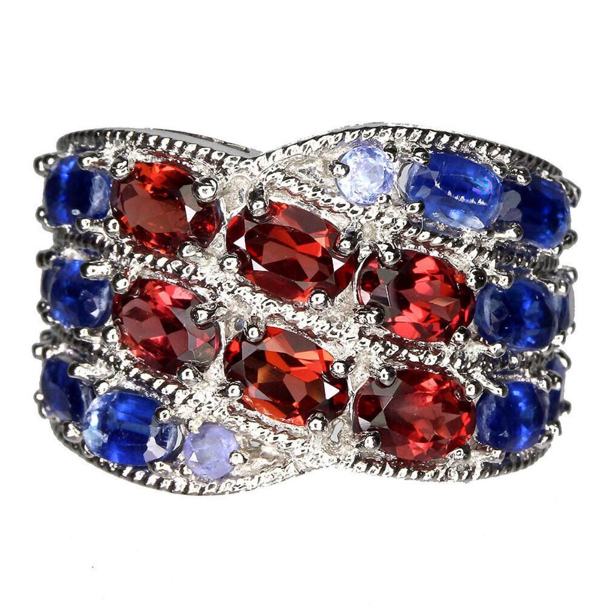 925 STERLING SILVER;PLATE-14K WHITE GOLD;RING SIZE/resizable-7.5;MAIN STONE-MOZAMBIQUE GARNET;OTHER GEMS-KYANITE, TANZANITE;TOTAL WEIGHT-9.65 GRAM (TOTAL WEIGHT OF SILVER + STONE)DIMENSION-* STONE 2.5 TO 6.0 X 4.0 MM. * RING SIZE 7.5 * FACE RING 27.0 X 17.0 MM.MAIN STONE SHAPE-OVAL CUT;MAIN STONE COLOR-TOP REDDISH;CLARITY/GRADE-IF TO VVSLUSTER-GORGEOUS;;TREATMENT-UNHEATED;ORIGIN-AFRICA;HARDNESS-7.0 - 7.5;