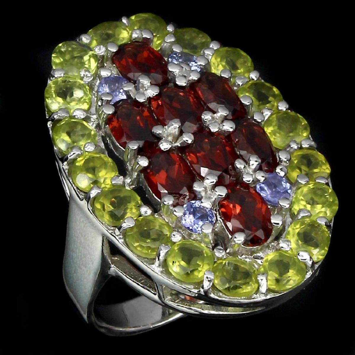 925 STERLING SILVER.....PLATE-14K WHITE GOLD;RING SIZE-9;MAIN STONE-MOZAMBIQUE GARNET;OTHER GEMS-PERIDOT,TANZANITE;TOTAL WEIGHT -68.53 CT (TOTAL WEIGHT OF SILVER + STONE);DIMENSION* STONE 3.0 TO 6.0 X 4.0 MM. * FACE RING 32.0 X 22.0 MM.;MAIN STONE SHAPE-OVAL CUT;MAIN STONE COLOR-TOP RICH RED ORANGE;CLARITY/GRADEIF TO VVS;LUSTERGORGEOUS;TREATMENTUNHEATED;ORIGINAFRICA;HARDNESS7.0 - 7.5