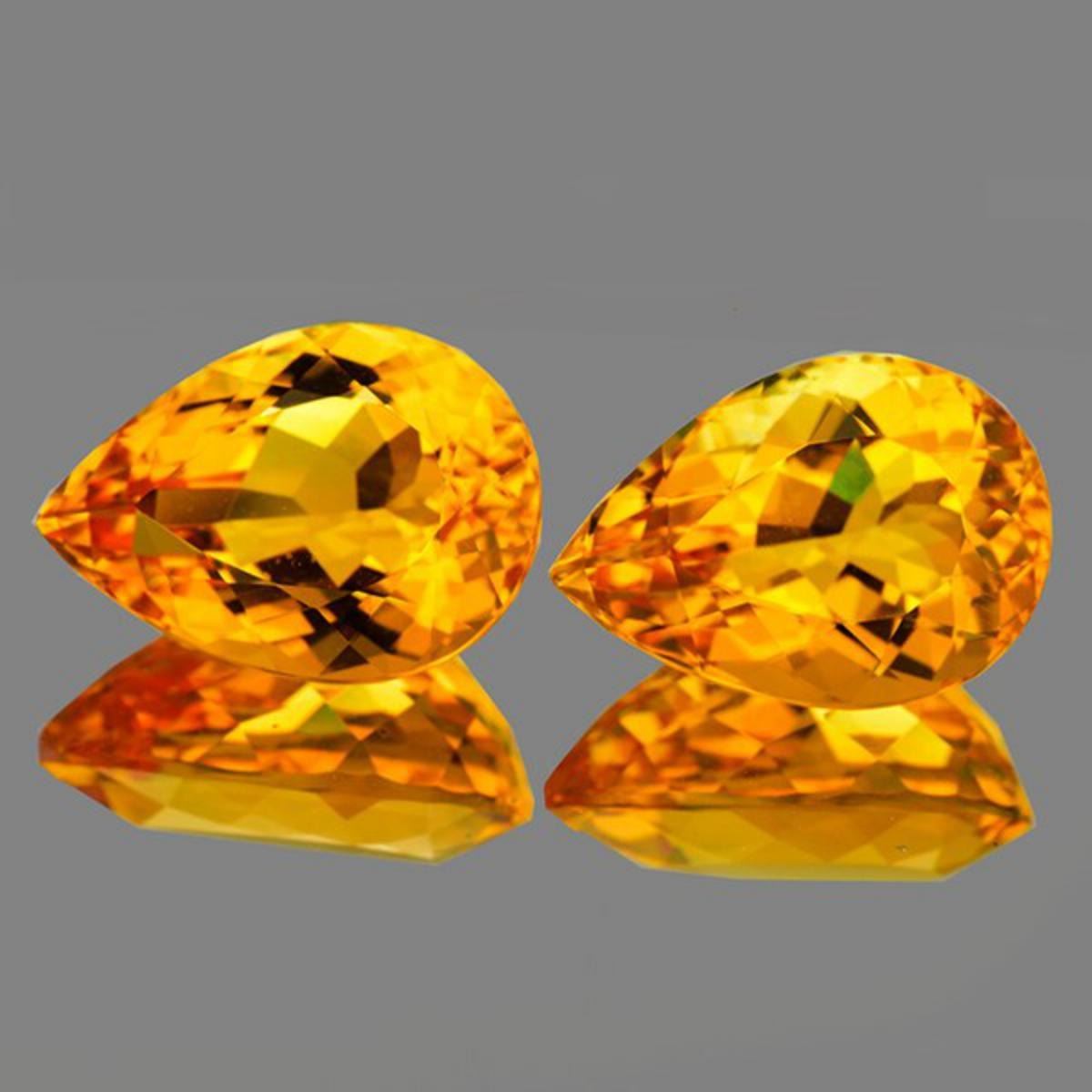 WEIGHT : 19.45 ctsSTONE NAME : Natural CitrineSIZE ( L x W x D ) : 17 x 12 mmCOLOR : Golden OrangeSHAPE : PearQUANTITY : 2 piecesLUSTER : Excellent (Satisfaction guaranteed)CLARITY : IF-VVS1 HIGH QUALITYHARDNESS : 7ORIGIN : Brazil TREATMENT : 100% Natural Unheated