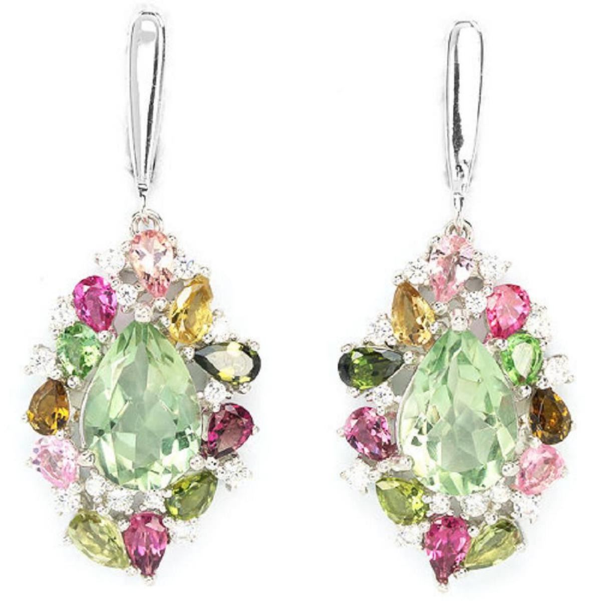 NATURAL GREEN AMETHYST, TOURMALINE & CZ 925SILVER EARRING 14K WHITE GOLD COATING; STONE SHAPE -PEAR PORTUGUESE CUT; STONE DIMENSION -12 X 8 MM.; ITEM WEIGHT -8.9 GRAM; COLOR -GREEN; CLARITY -IF - VVS; LUSTER -DAZZLING; TREATMENT -UNHEATED; ORIGIN OF STONE -BRAZIL; HARDNESS -7.0; FACE OF EARRING -41 X 16 MM. ; TOURMALINE -5 X 3 MM. , 4 X 3 MM.; WHITE CUBIC ZIRCONIA -1.7 MM. & 1.5 MM.