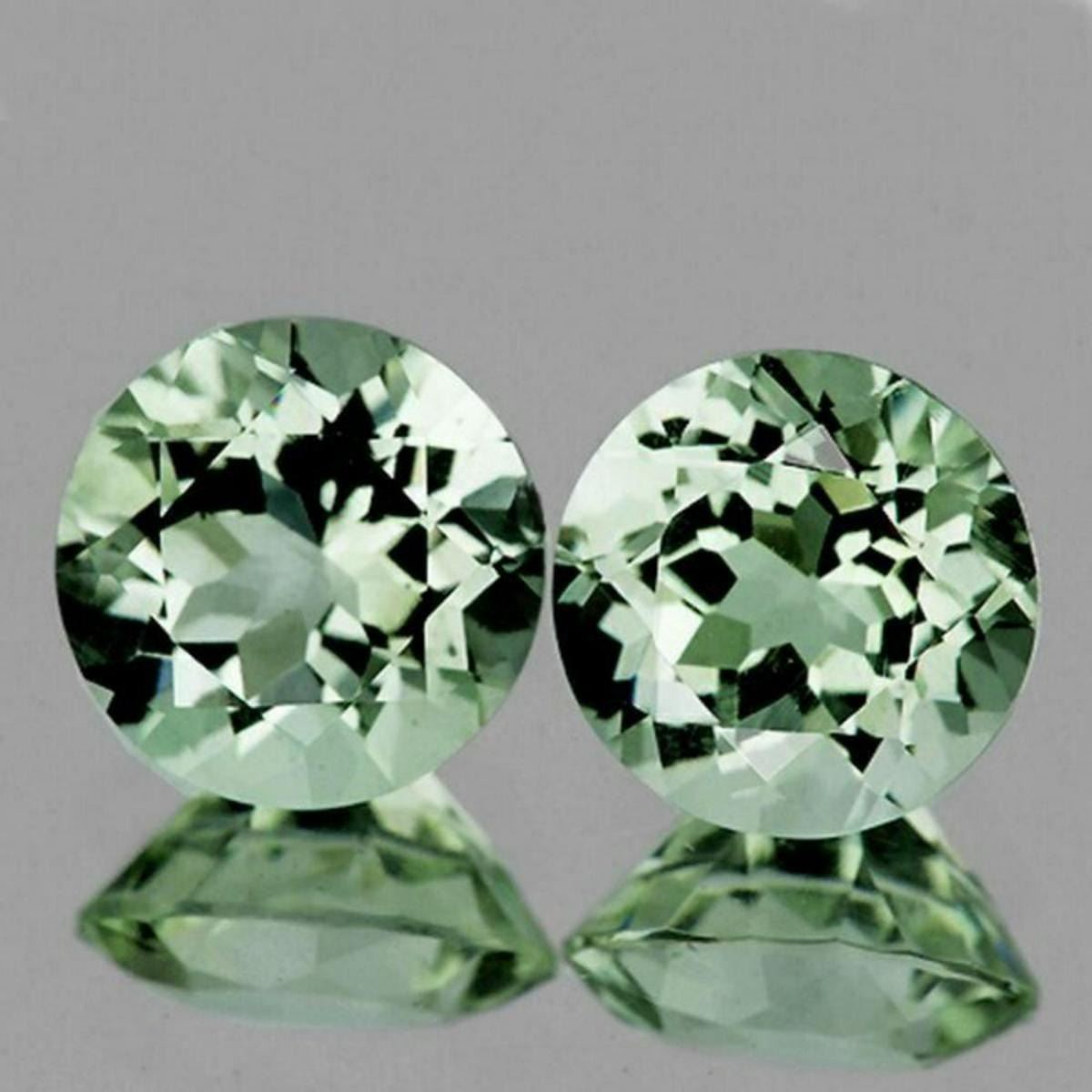 Natural Green Amethyst (Prasiolite)SIZE ( L x W x D ) : 8.00 mm;COLOR : Green;SHAPE : Round;QUANTITY : 2 piecesLUSTER : Excellent ;CLARITY : FLAWLESS-VVS BEST QUALITY;HARDNESS : 7;ORIGIN : Brazil; TREATMENT : 100% Natural Unheated;