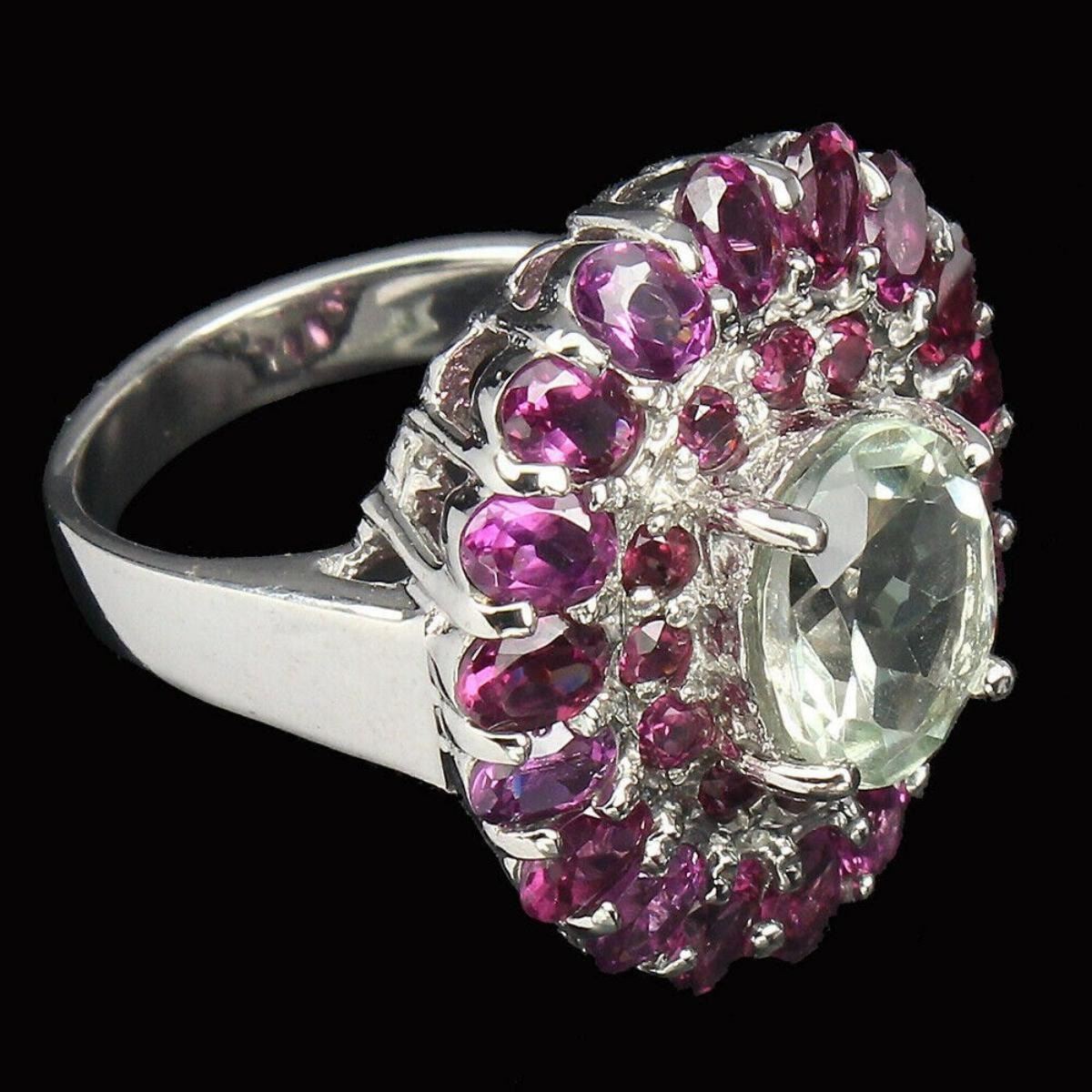 925 STERLING SILVER;PLATE-14K WHITE GOLD;RING SIZE/resizeable-7;MAIN STONE-GREEN AMETHYST;OTHER GEMS-RHODOLITE GARNET;TOTAL WEIGHT-8.54 GRAM (TOTAL WEIGHT OF SILVER + STONE)DIMENSION-* STONE 2.0 TO 10.0 X 8.0 MM. * RING SIZE 7.0 * FACE RING- 22.0 X 20.0 MM.;MAIN STONE SHAPE-OVAL CUT;MAIN STONE COLOR-TOP NICE GREEN;CLARITY/GRADE-IF TO VVS;ORIGIN-BRAZIL;