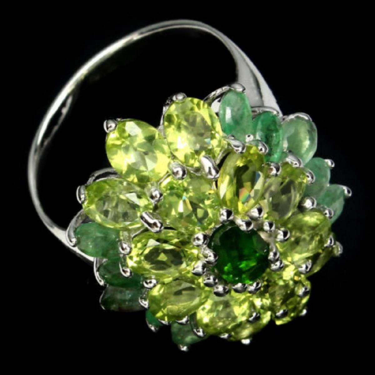 925 STERLING SILVERPLATE14K WHITE GOLDRING SIZE....8.5 (can be resized)MAIN STONECHROME DIOPSIDEOTHER GEMSEMERALD,PERIDOTTOTAL WEIGHT36.28 CT (TOTAL WEIGHT OF SILVER + STONE)DIMENSION* STONE 4.0 X 3.0 TO 6.0 X 4.0 MM. * RING 8.5 SIZE * FACE RING 27.0 X 21.0 MM.MAIN STONE SHAPEOVAL CUTMAIN STONE COLORTOP RICH GREENCLARITY/GRADEIF TO VVSLUSTERDELUXETREATMENTUNHEATEDORIGINRUSSIAHARDNESS5.0 - 5.5