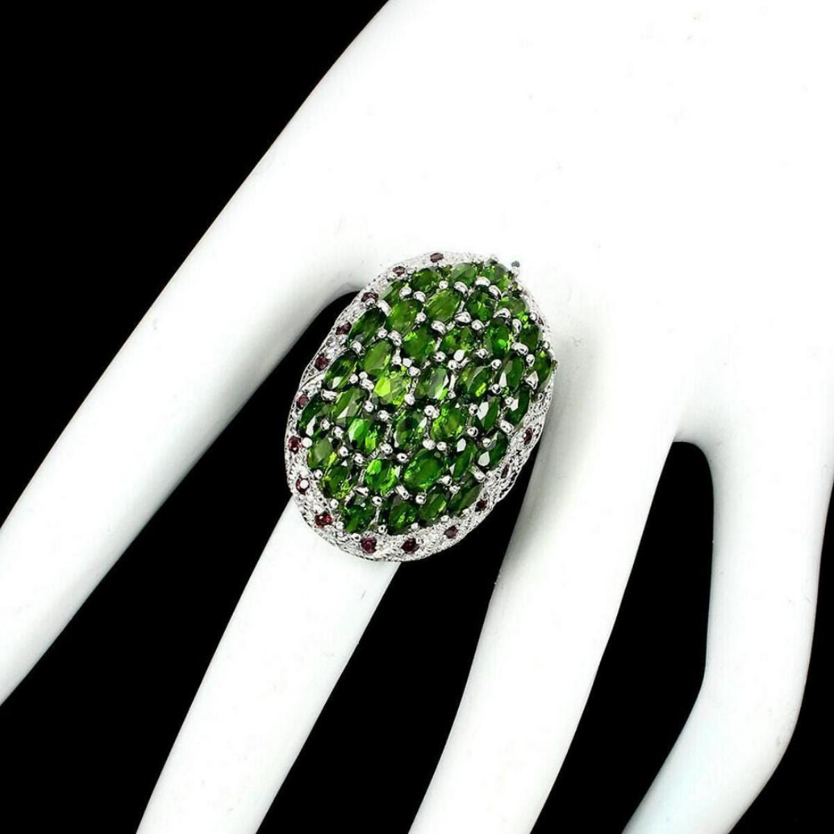 925 STERLING SILVER;PLATE-14K WHITE GOLD;RING SIZE-9(resizeable);MAIN STONE-CHROME DIOPSIDE;OTHER GEMS-RHODOLITE GARNET;TOTAL WEIGHT-13.09 GRAM (TOTAL WEIGHT OF SILVER + STONE)DIMENSION* STONE 2.0 TO 5.0 X 3.0 MM. * RING SIZE 9.0 * FACE RING 34.0 X 23.0 MM.;MAIN STONE SHAPE-OVAL CUT;MAIN STONE COLOR-TOP RICH GREEN;CLARITY/GRADE-IF TO VVS;TREATMENT-UNHEATED;ORIGIN-RUSSIA;HARDNESS-5.0 - 7.5;