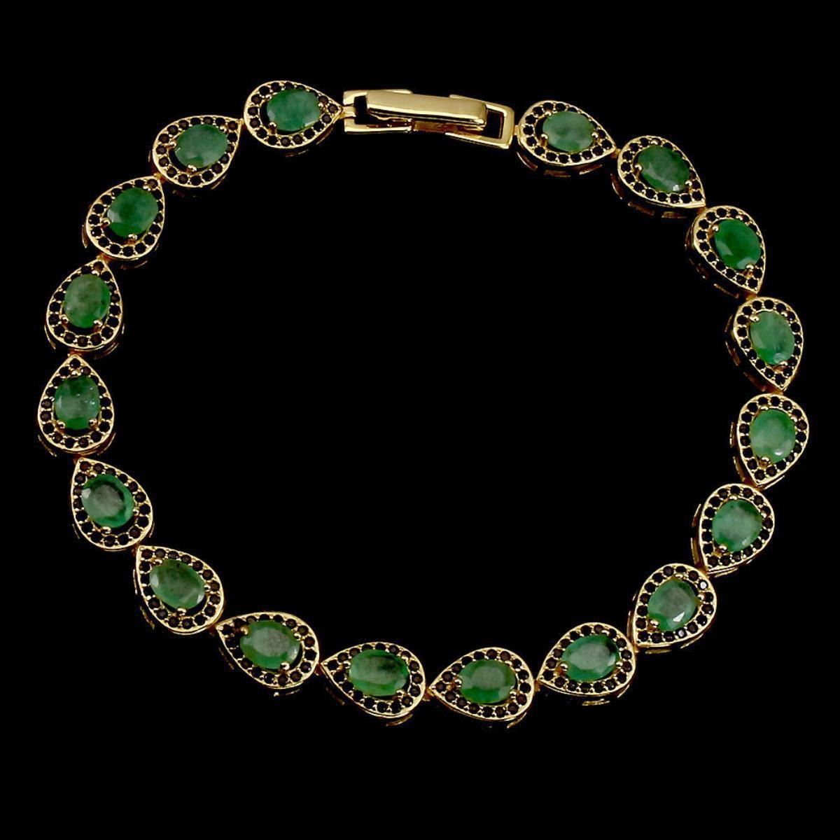 925 STERLING SILVER;PLATE14K YELLOW GOLD;LENGTH (INCHES)7.5;MAIN STONEEMERALD;OTHER GEMSBLACK SPINEL;TOTAL WEIGHT57.56 CT (TOTAL WEIGHT OF SILVER + STONE)DIMENSION* STONE 1.0 TO 6.0 X 4.0 MM. * FACE BRACELET 175.0 X 7.0 MM.MAIN STONE SHAPEOVAL CUTMAIN STONE COLORTOP RICH GREENCLARITY/GRADETRANSPARENTLUSTERMESMERIZINGTREATMENTUNHEATEDORIGIN- Columbia;HARDNESS7.5 - 8.0