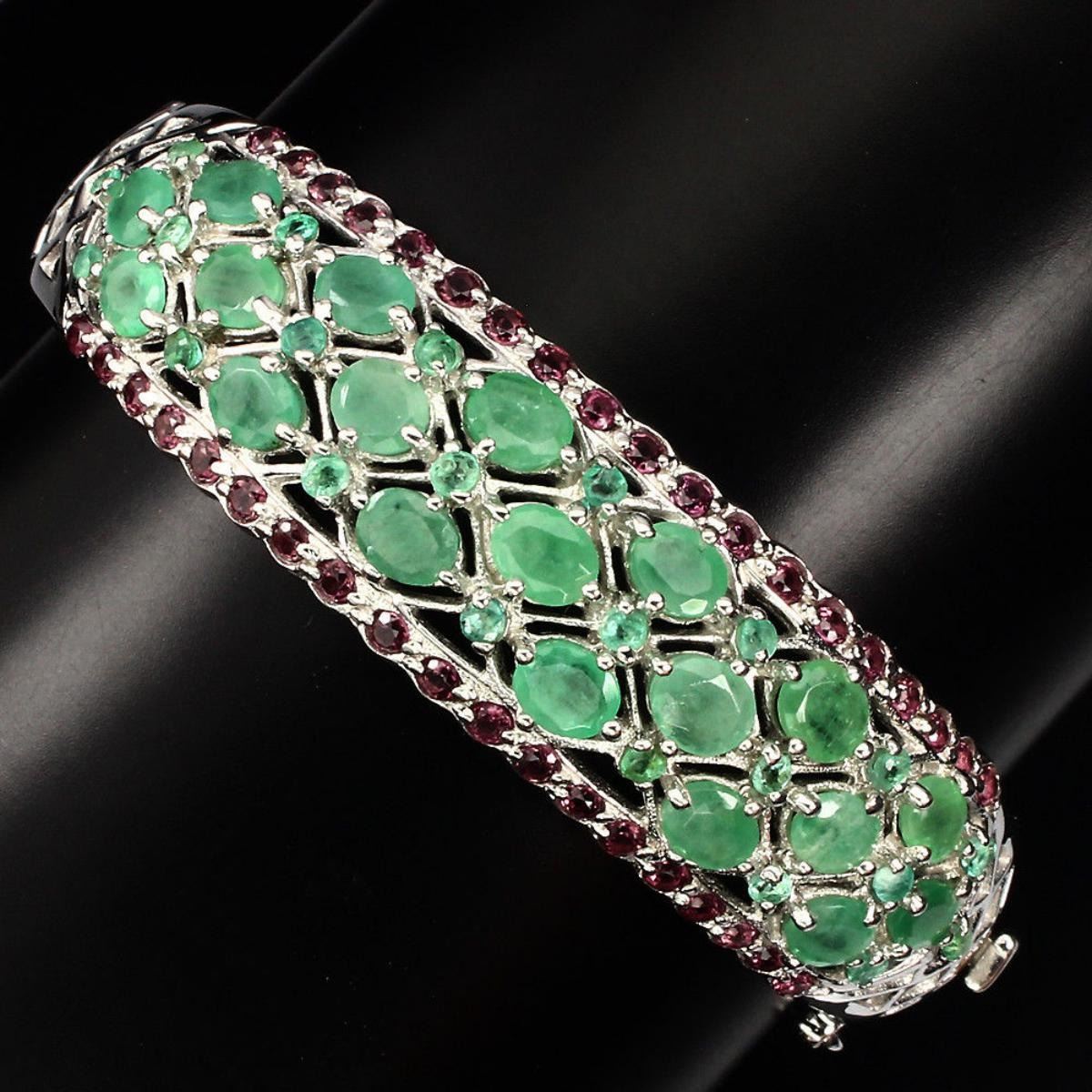 925 STERLING SILVER;PLATE14K WHITE GOLD;MAIN STONEEMERALDOTHER GEMSRHODOLITE GARNETTOTAL WEIGHT129.45 CT (TOTAL WEIGHT OF SILVER + STONE)DIMENSION* STONE 2.0 TO 5.0 X 4.0 MM. * DIAMETER 2.1 X 2.0 INCHES. * FACE BANGLE 58.0 X 17.0 MM.MAIN STONE SHAPEOVAL CUTMAIN STONE COLORTOP RICH GREENCLARITY/GRADETRANSPARENTLUSTERMESMERIZINGTREATMENTUNHEATEDORIGINBRAZILHARDNESS7.5 - 8.0