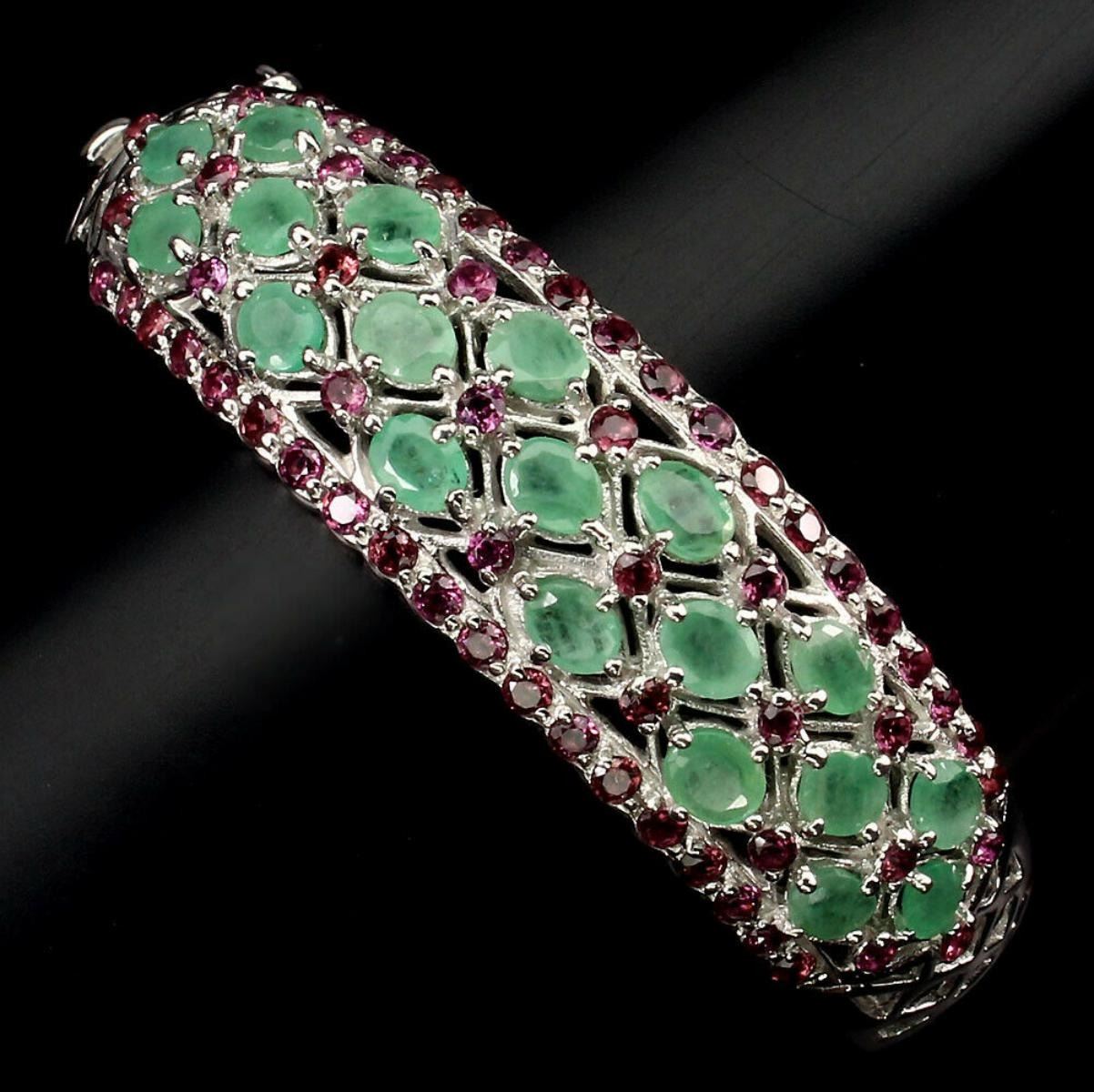 925 STERLING SILVER;PLATE14K WHITE GOLD;MAIN STONE-EMERALD;OTHER GEMS-RHODOLITE GARNET;TOTAL WEIGHT-126.07 CT (TOTAL WEIGHT OF SILVER + STONE)DIMENSION* STONE 2.0 TO 5.0 X 4.0 MM. * DIAMETER 1.9 X 1.9 INCHES. * FACE BANGLE 57.0 X 17.0 MM.-MAIN STONE SHAPEOVAL CUT-MAIN STONE COLORTOP RICH GREEN-CLARITY/GRADETRANSPARENT-LUSTERRAVISHING;TREATMENTUNHEATED;ORIGINBRAZIL;HARDNESS7.5 - 8.0;
