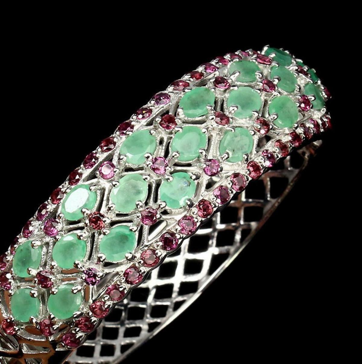 925 STERLING SILVER;PLATE14K WHITE GOLD;MAIN STONE-EMERALD;OTHER GEMS-RHODOLITE GARNET;TOTAL WEIGHT-126.07 CT (TOTAL WEIGHT OF SILVER + STONE)DIMENSION* STONE 2.0 TO 5.0 X 4.0 MM. * DIAMETER 1.9 X 1.9 INCHES. * FACE BANGLE 57.0 X 17.0 MM.-MAIN STONE SHAPEOVAL CUT-MAIN STONE COLORTOP RICH GREEN-CLARITY/GRADETRANSPARENT-LUSTERRAVISHING;TREATMENTUNHEATED;ORIGINBRAZIL;HARDNESS7.5 - 8.0;
