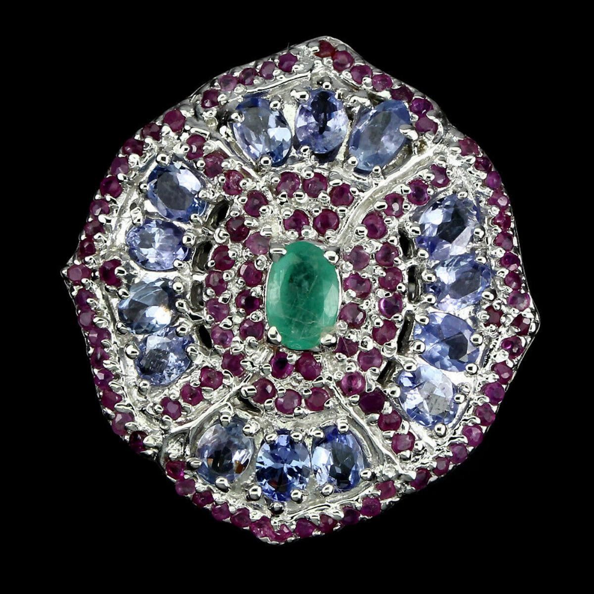 925 STERLING SILVER;PLATE-14K WHITE GOLD;RING SIZE-9(Resizeable)MAIN STONE-EMERALD;OTHER GEMS-RUBY, TANZANITE;TOTAL WEIGHT-11.9 GRAM (TOTAL WEIGHT OF SILVER + STONE)DIMENSION* STONE 1.0 TO 6.0 X 4.0 MM. * RING SIZE 9.0 * FACE RING 30.0 X 28.0 MM.;;MAIN STONE SHAPE-OVAL CUT;MAIN STONE COLOR-TOP RICH GREEN;TREATMENT-UNHEATED;ORIGIN-BRAZIL;HARDNESS7.0 - 9.0