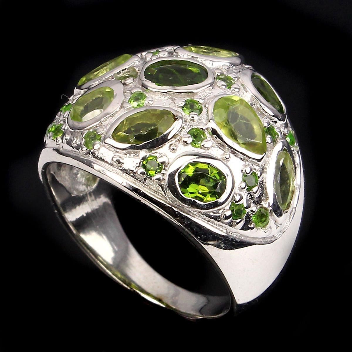 925 STERLING SILVER;PLATE-14K WHITE GOLD;RING SIZE-8;MAIN STONE-PERIDOT;OTHER GEMS-CHROME DIOPSIDE;TOTAL WEIGHT-40.64 CT (TOTAL WEIGHT OF SILVER + STONE)DIMENSION* STONE 1.5 TO 6.0 X 4.0 MM. * FACE RING 22.0 X 19.0 MM.MAIN STONE SHAPE-MARQUISE CUT;MAIN STONE COLOR-TOP RICH GREEN;CLARITY/GRADE-IF TO VVS;TREATMENT-UNHEATED;ORIGIN-PAKISTAN, Russia;HARDNESS5.0 - 7.0