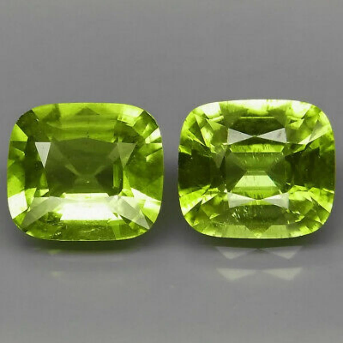 Natural Peridot......Pair; SHAPE : cushion; size : 9.00 x 8 mm QUANTITY : 2 pieces (Perfectly Matched Pair) COLOR : AAA Green Best Color; CLARITY : clean; ORIGIN : Burma; HARDNESS : 7