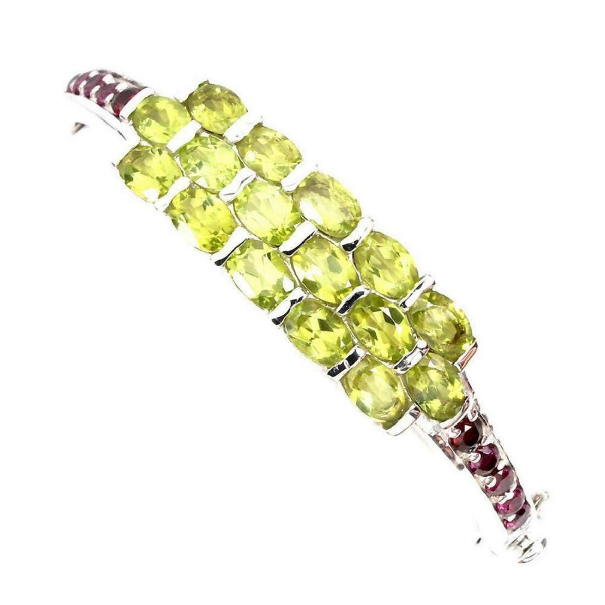 925 STERLING SILVER PLATE 14K WHITE GOLD RING SIZE/LENGTH (INCHES) MAIN STONE PERIDOT OTHER GEMS RHODOLITE GARNET TOTAL WEIGHT 74.86 CT (TOTAL WEIGHT OF SILVER + STONE) DIMENSION * STONE 3.0 TO 7.0 X 5.0 MM. * DIAMETER 1.8 INCHES. * FACE BANGLE 55.0 X 11.0 MM. MAIN STONE SHAPE OVAL CUT MAIN STONE COLOR TOP RICH GREEN CLARITY/GRADE IF TO VVS LUSTER GRACEFULLY TREATMENT UNHEATED ORIGIN PAKISTAN HARDNESS 6.5 - 7.5