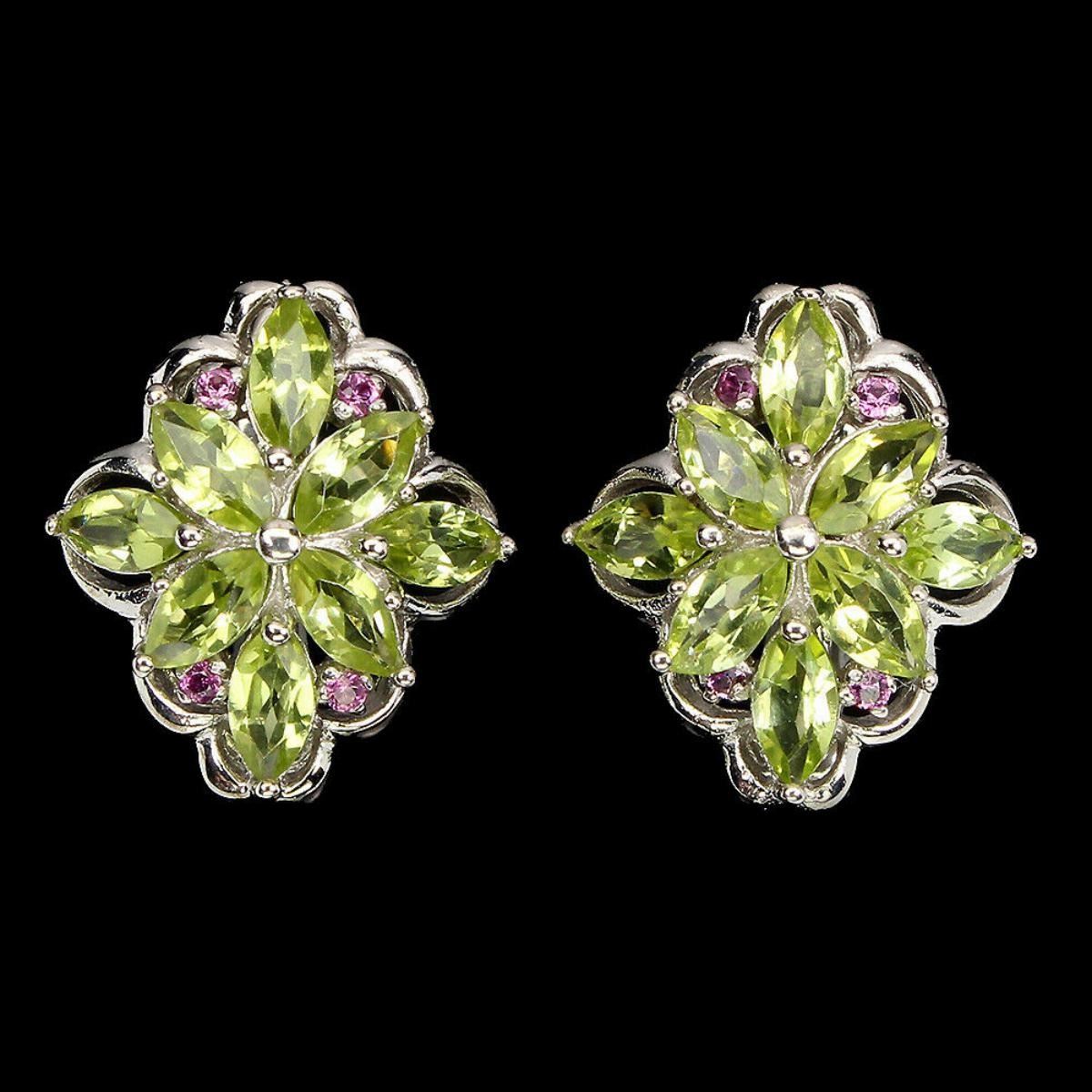 925 STERLING SILVER;PLATE-14K WHITE GOLD;MAIN STONE-PERIDOT;OTHER GEMS-RHODOLITE GARNET;TOTAL WEIGHT-6.71 GRAM (TOTAL WEIGHT OF SILVER + STONE)DIMENSION-* STONE 1.5 TO 6.0 X 3.0 MM. * FACE EARRINGS 19.0 X 17.0 MM.;MAIN STONE SHAPE-MARQUISE CUT;MAIN STONE COLOR-TOP RICH GREEN;CLARITY/GRADE-IF TO VVS;TREATMENT-UNHEATED;ORIGIN-PAKISTAN;HARDNESS-6.5 - 7.0