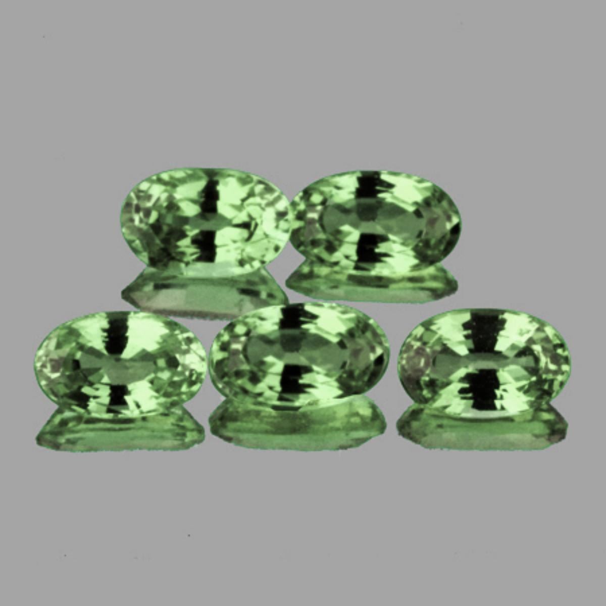 Natural Green Sapphire....... SHAPE : Oval SIZE ( L x W x D ) : 5.00 x 3.50 mm; QUANTITY : 5 pieces ; COLOR : AAA Green; CLARITY : Flawless-VVS1; ORIGIN : Ceylon; HARDNESS : 9; LUSTER : Excellent!!! TREATMENT : Heated ;