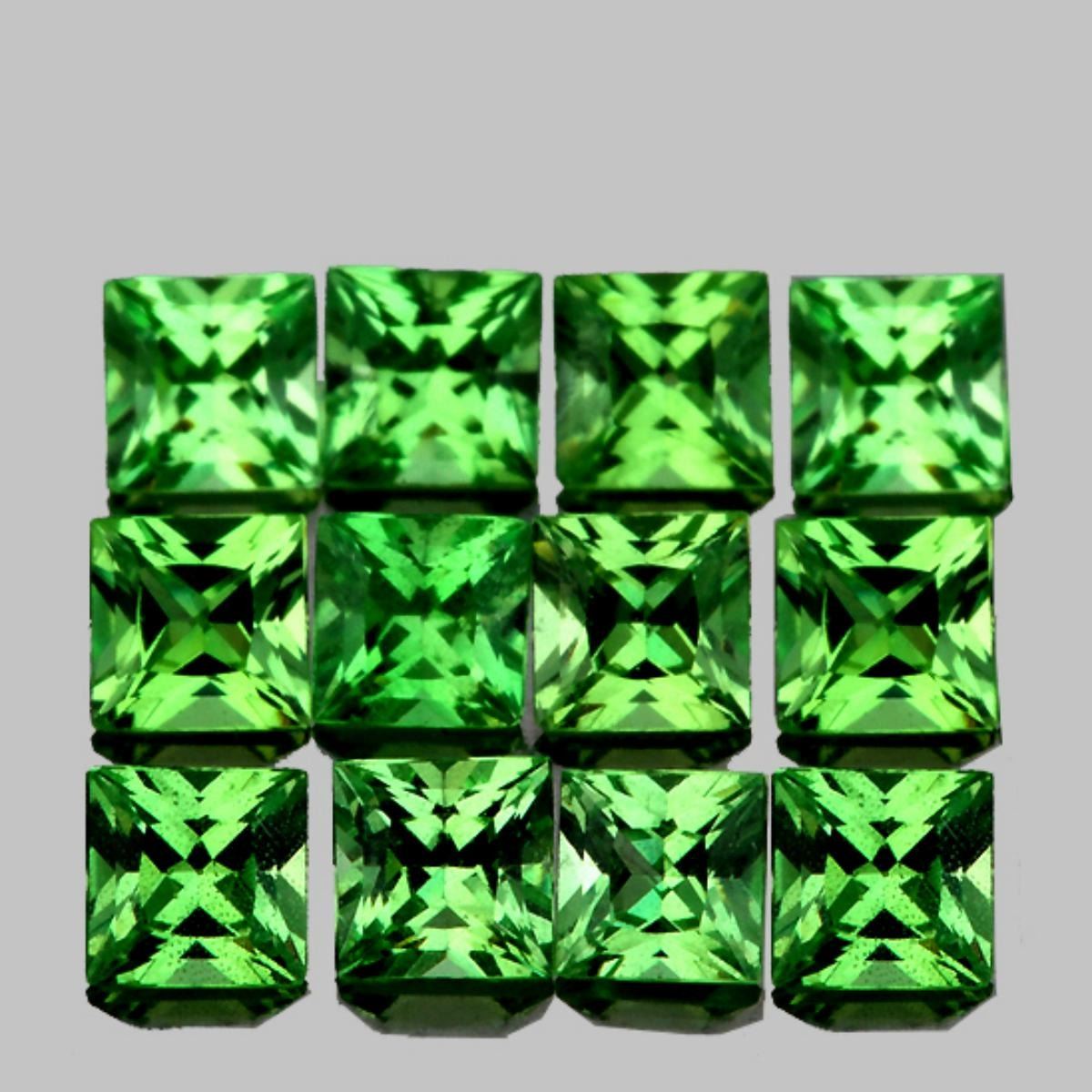 Natural Green Garnet (Tsavorite) SHAPE : Square (Princess Cut) SIZE ( L x W x D ) : 2.30 mm; QUANTITY : 12 pieces ( Perfectly Matched Set ) COLOR : Chrome Green; CLARITY : Flawless-VVS; ORIGIN : Tanzania; HARDNESS : 7 LUSTER : AAA Fire!!(Excellent Cutting) TREATMENT : 100% Natural Unheated;