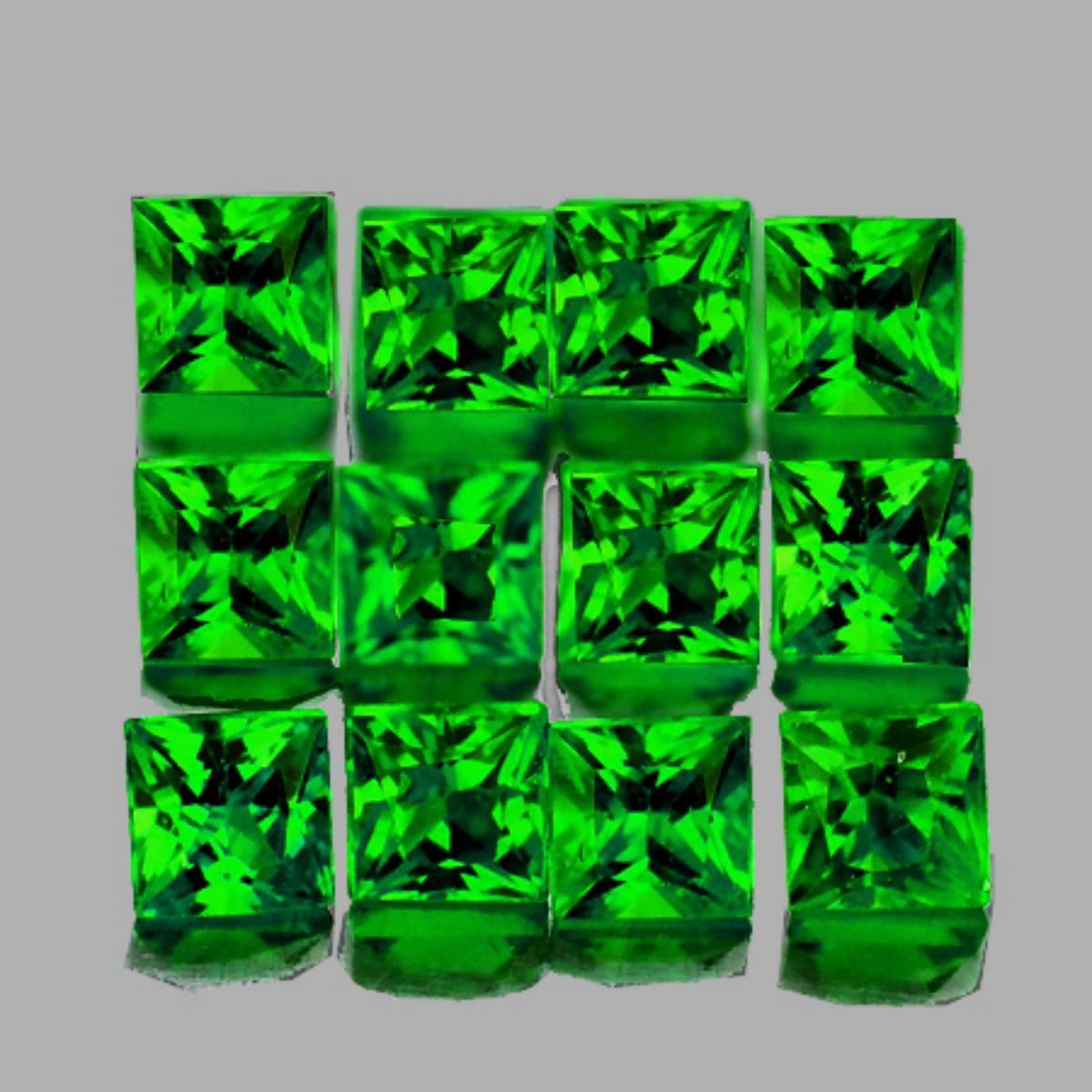 Natural Green Garnet (Tsavorite) SHAPE : Square (Princess Cut) SIZE ( L x W x D ) : 2.30 mm; QUANTITY : 12 pieces ( Perfectly Matched Set ) COLOR : Chrome Green; CLARITY : Flawless-VVS; ORIGIN : Tanzania; HARDNESS : 7 LUSTER : AAA Fire!!(Excellent Cutting) TREATMENT : 100% Natural Unheated;