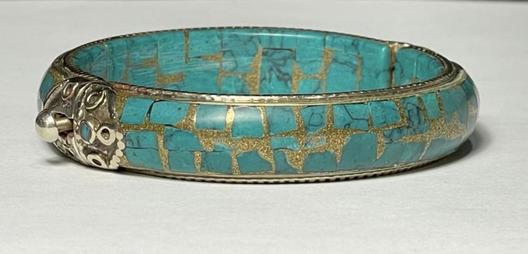 Natural Tibet Hand Made Turquoise free size Bangle.......This Bangle is made by Tibetian Tribal ladies...completely with natural stones....it is free size as there is a lock to open the bangle and fits all sizes.