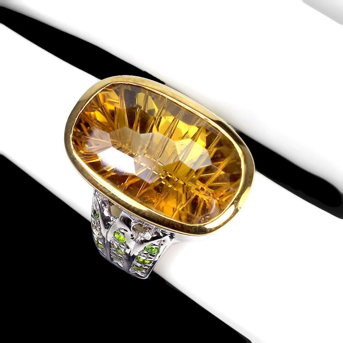 925 STERLING SILVER;PLATE-2-TONE WHITE & YELLOW 14K GOLD;RING SIZE-7(RESIZABLE);MAIN STONE-CITRINE;OTHER GEMS-CHROME DIOPSIDE;TOTAL WEIGHT-13.35 GRAM (TOTAL WEIGHT OF SILVER + STONE);DIMENSION-* STONE 1.5 TO 20.0 X 13.0 MM.* RING SIZE 7.0* FACE RING 22.0 X 21.0 MM.;MAIN STONE SHAPE-CUSHION; MAIN STONE COLOR-YELLOW;CLARITY/GRADE-IF;TREATMENT-UNHEATED;ORIGIN-BRAZIL;