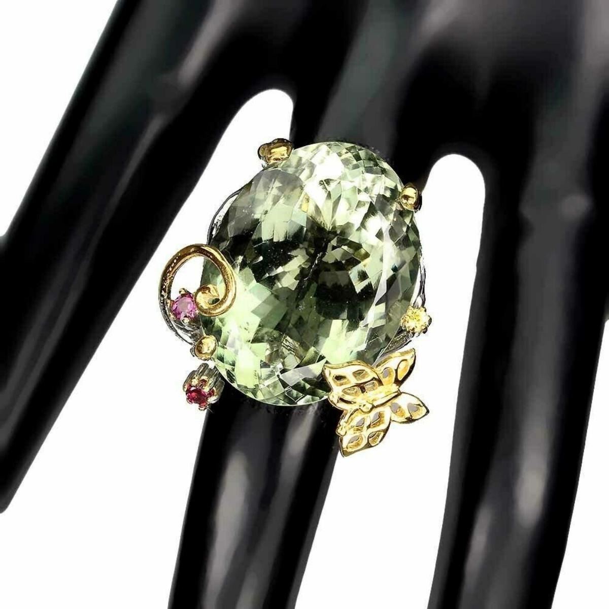 925 STERLING SILVER;PLATE-2-TONE WHITE & YELLOW 14K GOLD;RING SIZE/resizeable - 8;MAIN STONE-GREEN AMETHYST;OTHER GEMS-RHODOLITE GARNET, SAPPHIRE;TOTAL WEIGHT-14.13 GRAM (TOTAL WEIGHT OF SILVER + STONE)DIMENSION-* STONE 2.0 TO 24.0 X 18.0 MM. * RING SIZE 8.0 * FACE RING -26.0 MM.;MAIN STONE SHAPE-OVAL CUT;MAIN STONE COLOR-TOP NICE GREEN;CLARITY/GRADE-IF;ORIGIN-BRAZIL;HARDNESS-7;